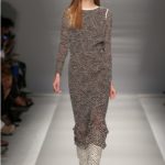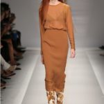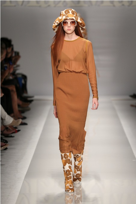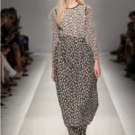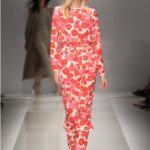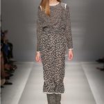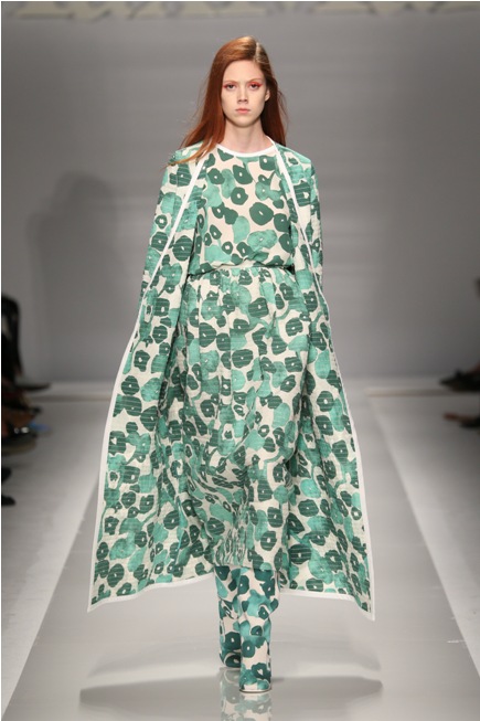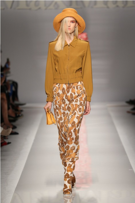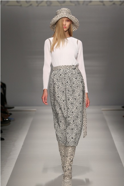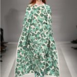 Molte le piccole stampe geometriche tono su tono vagamente puntiformi e molti i fiori -in micro questi ultimi rimandano a certi macro di Andy Warhol- sia nei toni pacati sia in quelli più accesi. E, quando sfilano i fiori, rosa carico, verde mente, giallo ocra, compaiono dalla testa ai piedi, dai cappelli agli stivali, passando anche dalle cinture -spesso a vita alta, le gonne e i pantaloni-. Abiti come prati, come giardini, come serre. Capelli lisci che spuntano da tese larghe simili a croccanti corolle, calzature che, amalgamate al tutto, appaiono come protesi imprescindibili.