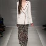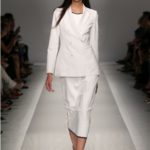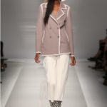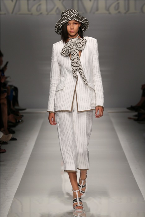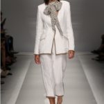 Bellissimi i panta-tailleur bianchi dalla gessatura appena tratteggiata e le camicie bon-ton dal collo a nastro che completano l’insieme.