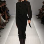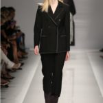E poi il classico double per gli iconici caban -spesso imitati, mai raggiunti- e la riscoperta dell’alcantara, duttile e facile da lavorare. Trattata come se fosse suède, sostituisce la pelle nei piccoli blouson dal tratto militaresco, negli indiscutibili trench primaverili, nelle sontuose gonne plissettate lunghe fino al malleolo. Perfino negli smoking che si propongono imperiosamente nella loro intramontabile beltà -neri ma “spalancati”, proprio come gli occhi di una indimenticabile Morticia Addams….-