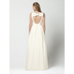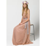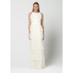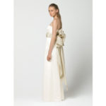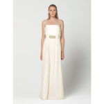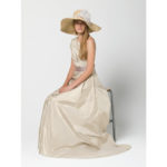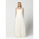 I tessuti sono leggerissimi, soffici e preziosi: organza, tulle, seta, chiffon e georgette si alternano in un gioco di leggere sovrapposizioni e morbida fluidità. Le linee sono caratterizzate da freschi tagli neo-couture e dettagli d’atelier come fiocchi, drappeggi, effetti origami, pietre, o preziosi ma minimali ricami. La palette spazia nelle infinite e luminose tonalità del total white, dalle sfumature del latte a quelle più “calde” dell’avorio, dal bianco ottico al panna e perla, concedendosi qualche tocco di colore con le tenui nuance del cipria make up, champagne o pastello.