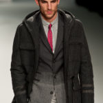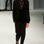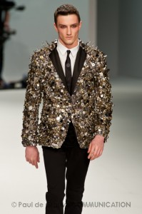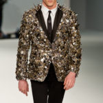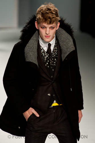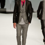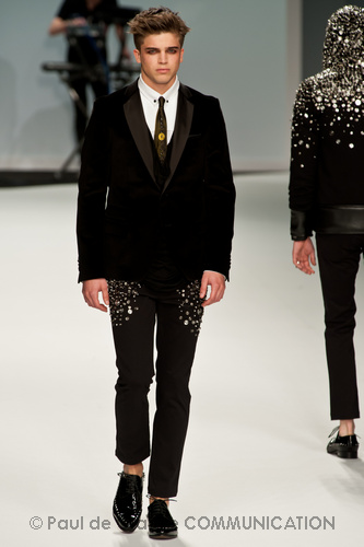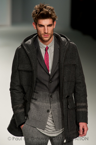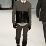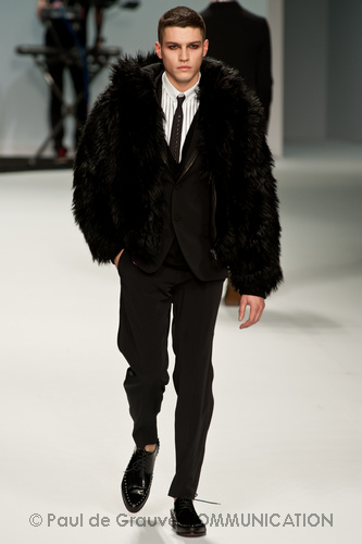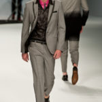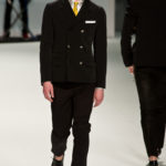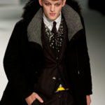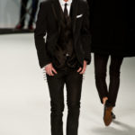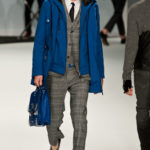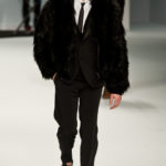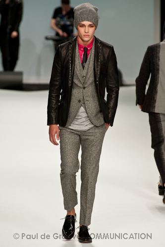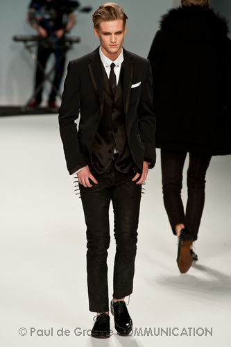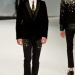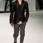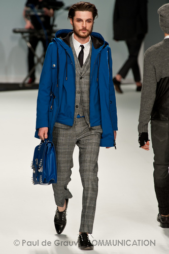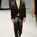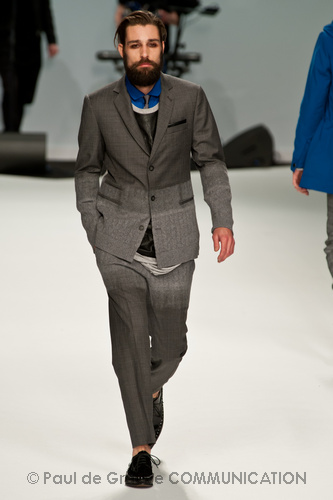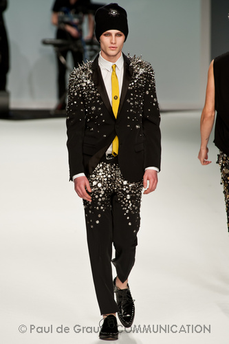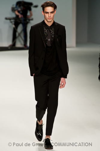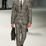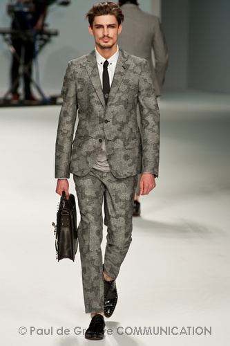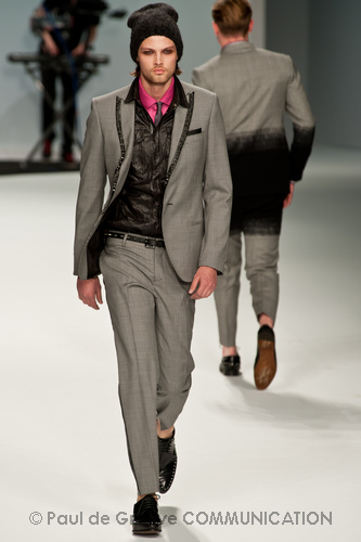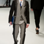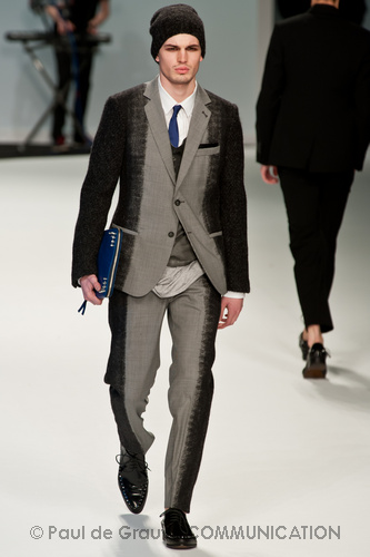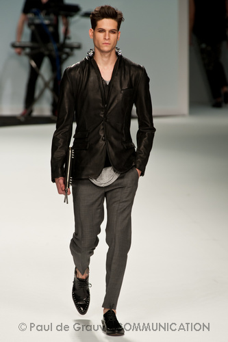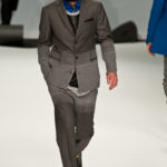 Le primissime uscite raccontano un uomo a metà tra il manager e il punk-rock: su giacche e pantaloni, rigorosamente neri, sono applicate borchie o cascate di monetine che, tintinnando ad ogni passo, ben si sposano con i “lamenti” elettronici di Burger Girl. Ed ecco che piano piano le borchie scompaiono, e il nero, poco alla volta, cede il passo al grigio. E allora via a completi eleganti accompagnati da improbabili ventiquattrore borchiate, dove diverte la sfumatura dei colori, che va di pari passo con la sfumatura dei tessuti: passiamo così dal grigio del principe di Galles al nero della maglia, tutto sulla stessa giacca. Al grigio si aggiunge il blu elettrico, creando un look giovane e raffinato, in uno dei pochi accostamenti di questa collezione che davvero convince.
