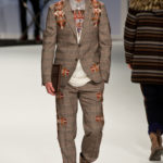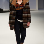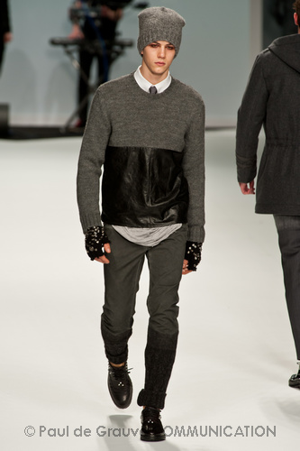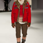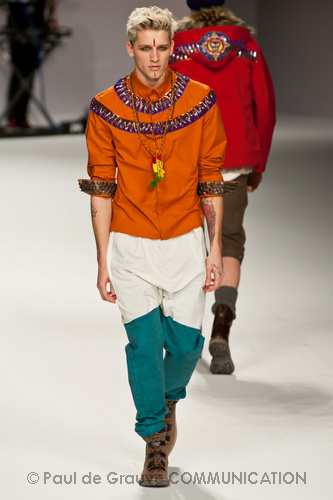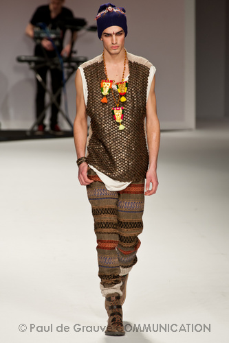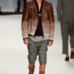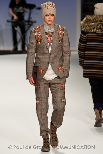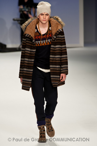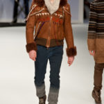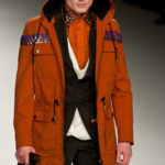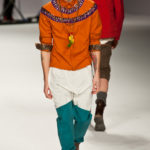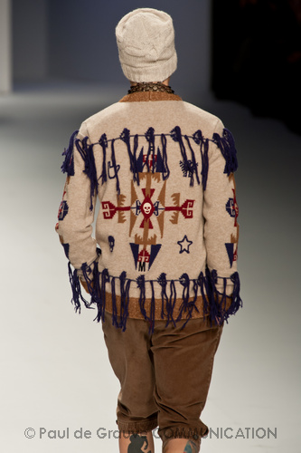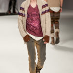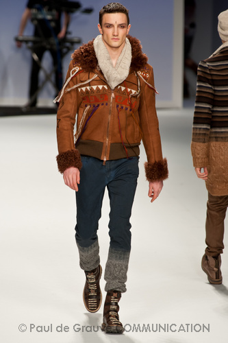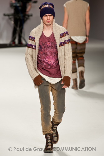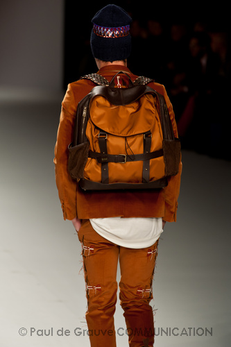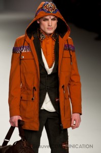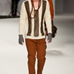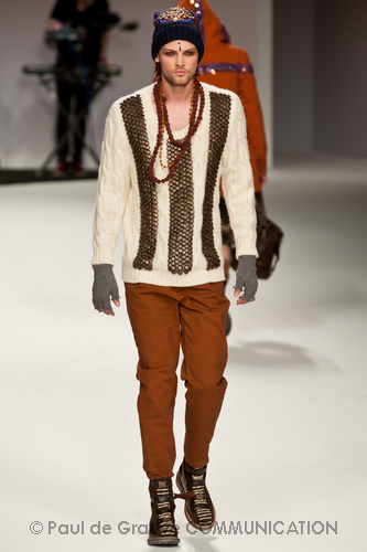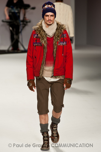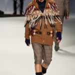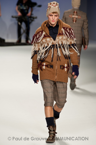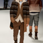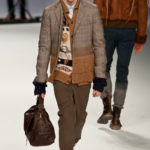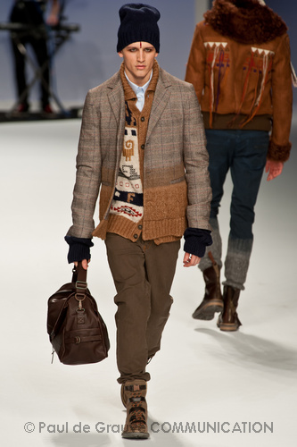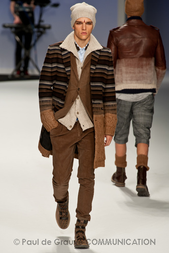 Ma ecco una nuova virata, il blu cede il passo al marrone, il grigio si fonde con l’arancio, l’ocra, il panna, il giallo, il bordeaux. I completi da uomo d’affari si trasformano gradatamente in mise adatte ad una scampagnata in montagna; e allora vediamo comparire maglioni pesanti e berretti di lana accompagnati da pantaloni al ginocchio, scarponcini e voluminosi zaini in spalla, come la miglior tradizione boy scout. I tessuti dei maglioni sono sfilacciati a dare l’illusione di frange, e tanto ci ricordano la collezione donna a/i 2011 – 2012 di Isabel Marant.