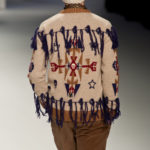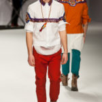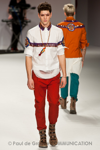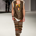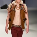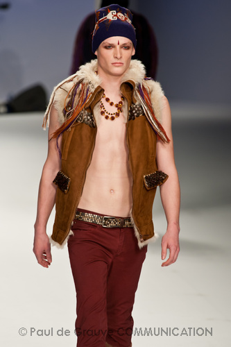 Ed è qui che la purificazione che questa collezione ci vuole raccontare raggiunge il suo culmine. Ai pesanti maglioni si sostituisce una fluttuante camicia bianca, quasi impalpabile e semitrasparente, arricchita da cascate di collane dal sapore indiano, in un’esplosione di colori caldi. Ed è a questo punto che comincia uno streap tease dal finale scontato: da camicia, pantalone lungo e maglietta passiamo a camicia e pantalone, poi camicia e pantaloncini, camicia e mutande… per finire con il nudo integrale, annunciato, francamente gratuito e anche un po’ ridicolo di Giuseppe Sartori, attore della compagnia teatrale Ricci e Forte. Ed ecco svelato l’inganno: la “presentazione forte”, la “provocazione” che Modica e Gigliotti ci avevano promesso è davvero questa? Avremmo preferito che avesse avuto a che fare con ciò di cui la moda si occupa, e non con il suo esatto opposto.