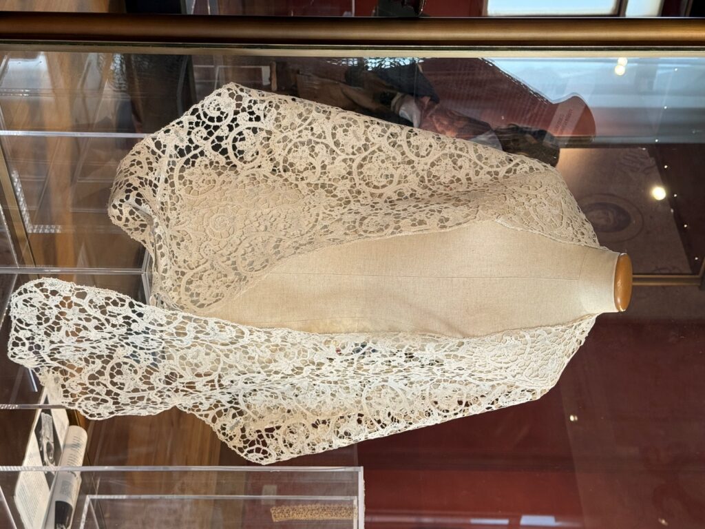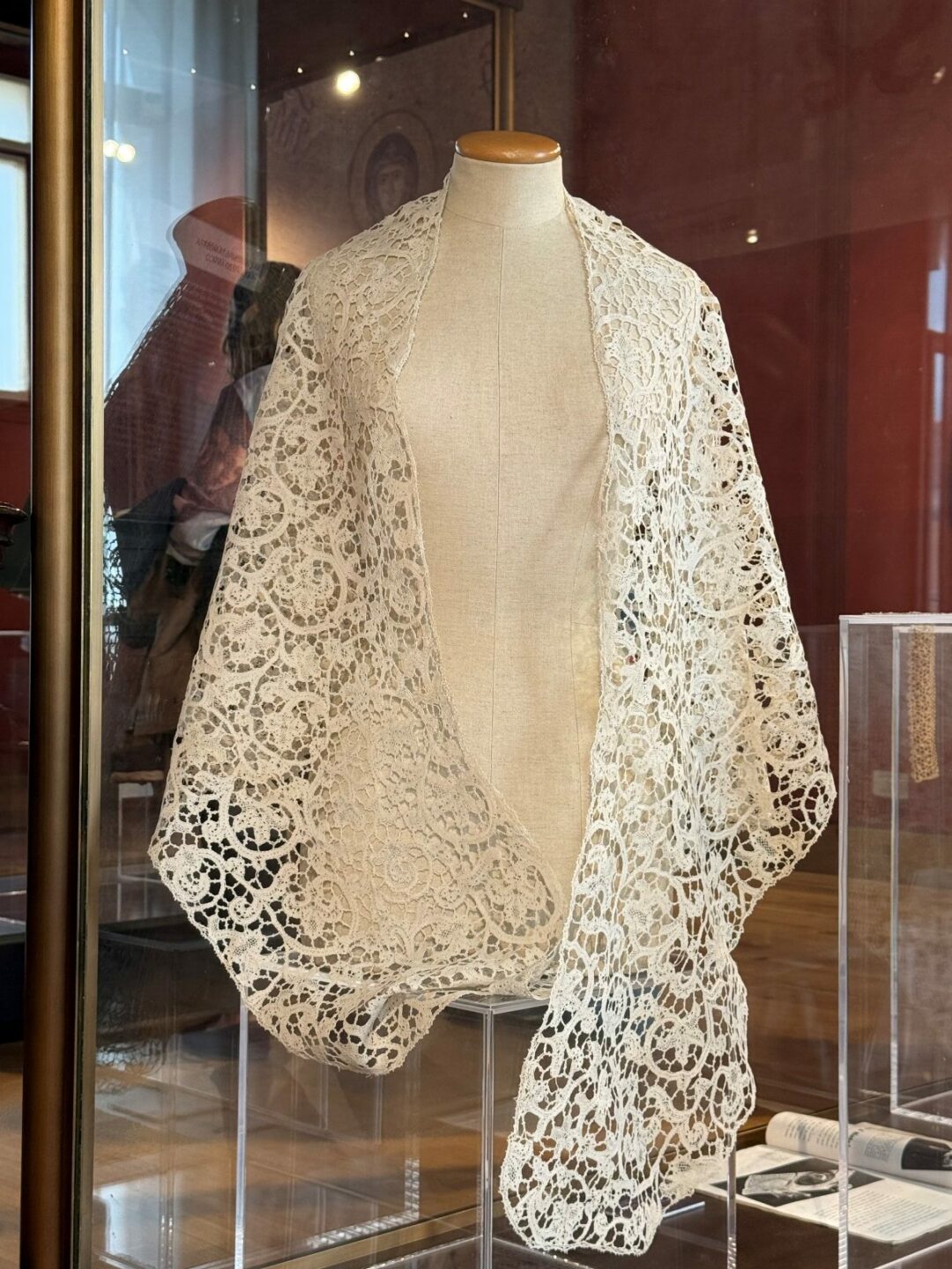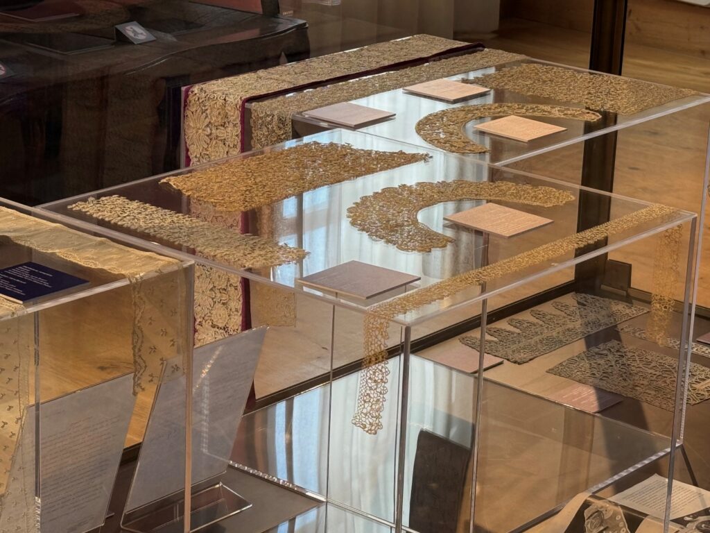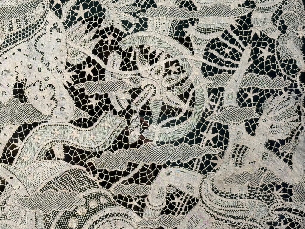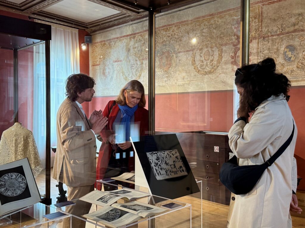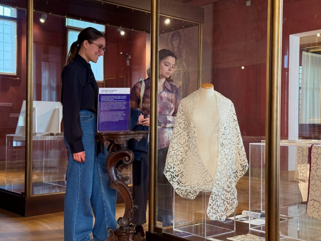 Accanto a queste opere, il visitatore incontra una selezione di merletti antichi, che dialogano con le creazioni moderne mettendo in luce continuità e innovazioni tecniche e stilistiche. Il percorso si conclude con una sezione dedicata al secondo dopoguerra, che documenta il rilancio del merletto d’autore attraverso nuove collaborazioni tra artisti e manifatture. Ad arricchire l’esposizione contribuiscono disegni preparatori, cartoni esecutivi e pubblicazioni d’epoca, con particolare attenzione a riviste di riferimento come Domus, Fili ed Emporium, fondamentali per la diffusione del gusto moderno e del dibattito sulle arti decorative.