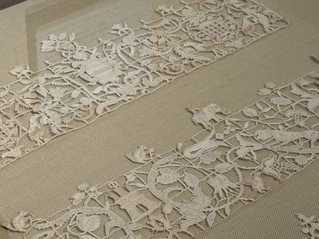 La mostra Merletti d’Autore, dedicata a Doretta Davanzo Poli tra le più autorevoli studiose del merletto italiano, ha una parte che potremmo dire didattica, dedicata a far conoscere le due principali tecniche di realizzazione del merletto, ad ago e a tombolo. Le opere sono poi suddivise per aree di produzione, mettendo in luce alcune tra le più importanti manifatture italiane, come Venezia, Cantù e Bologna.