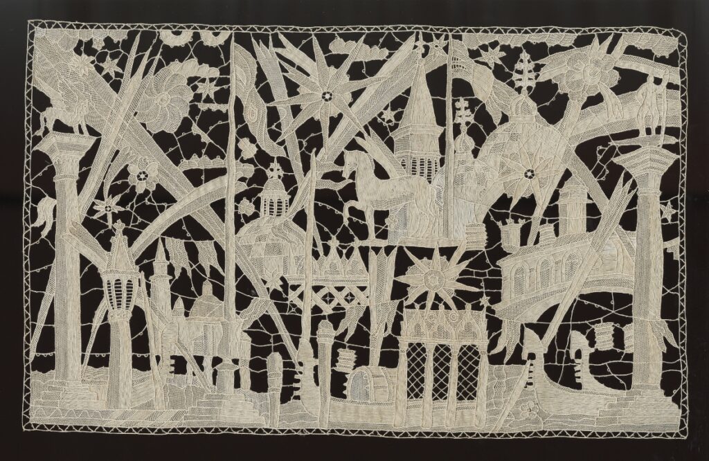 Come abbiamo detto il focus della mostra è limitato agli anni Venti e Trenta del Novecento, riconoscendo che è nel periodo compreso tra il 1927 e il 1932 che il merletto si afferma come forma autonoma di arte decorativa, al pari del vetro e della ceramica. Storicamente e simbolicamente, la nascita del merletto d’autore coincide con la presentazione del Corteo in costume di Giulio Rosso per Jesurum alla III Biennale di Monza. In questo frangente storico si consolida una nuova concezione progettuale, fondata sulla collaborazione tra manifatture di eccellenza e artisti e designers. Questo è un fenomeno che non riguarda esclusivamente l’ambito veneziano ma si estende anche ad altri importanti centri produttivi italiani. Nascono così opere considerate veri manifesti di modernità, spesso realizzate come pezzi unici o su commissione per grandi esposizioni: la loro rarità testimonia il valore sperimentale e artistico del merletto d’autore.