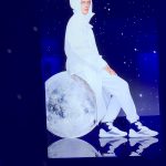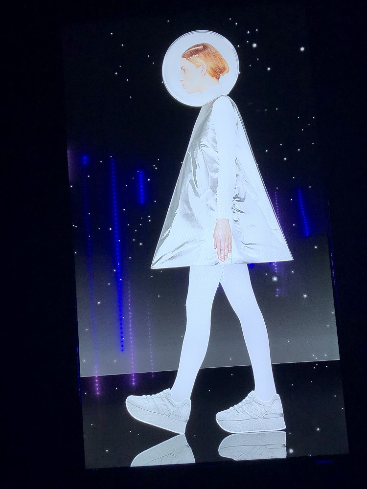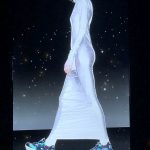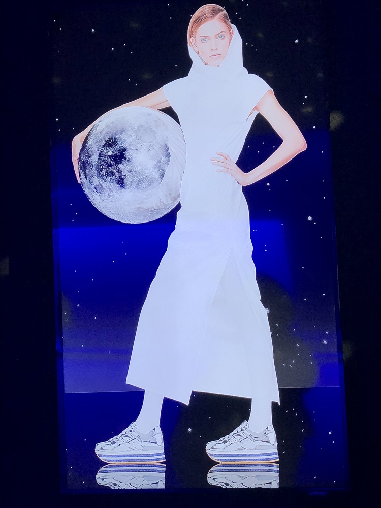 Proiezioni di figure vestite di bianco su cieli punteggiati di luce; il mondo in mano, il bagliore ai piedi; abiti che sembrano carta di cioccolato, colli simili a quelli visti in certi ritratti rinascimentali; glitter iridescenti che catturano gli occhi, stringhe luccicanti come sentieri tracciati per ritrovare la strada di casa.
