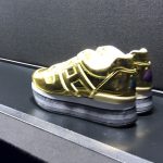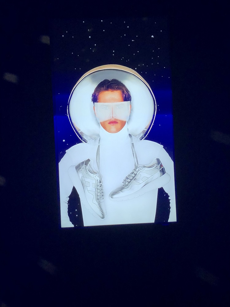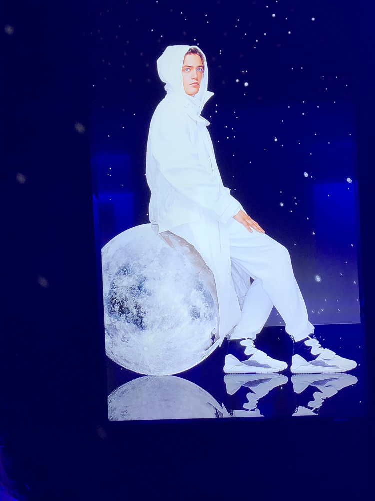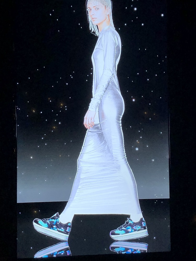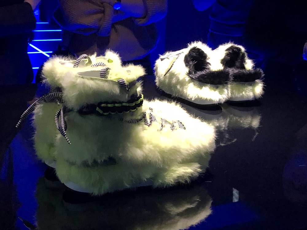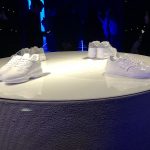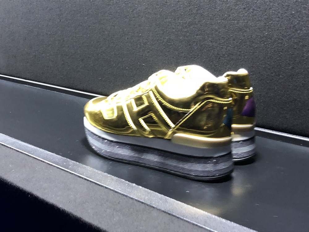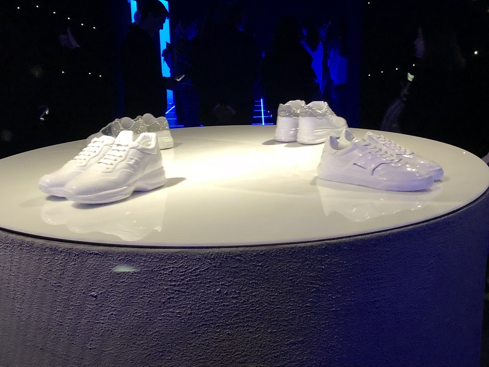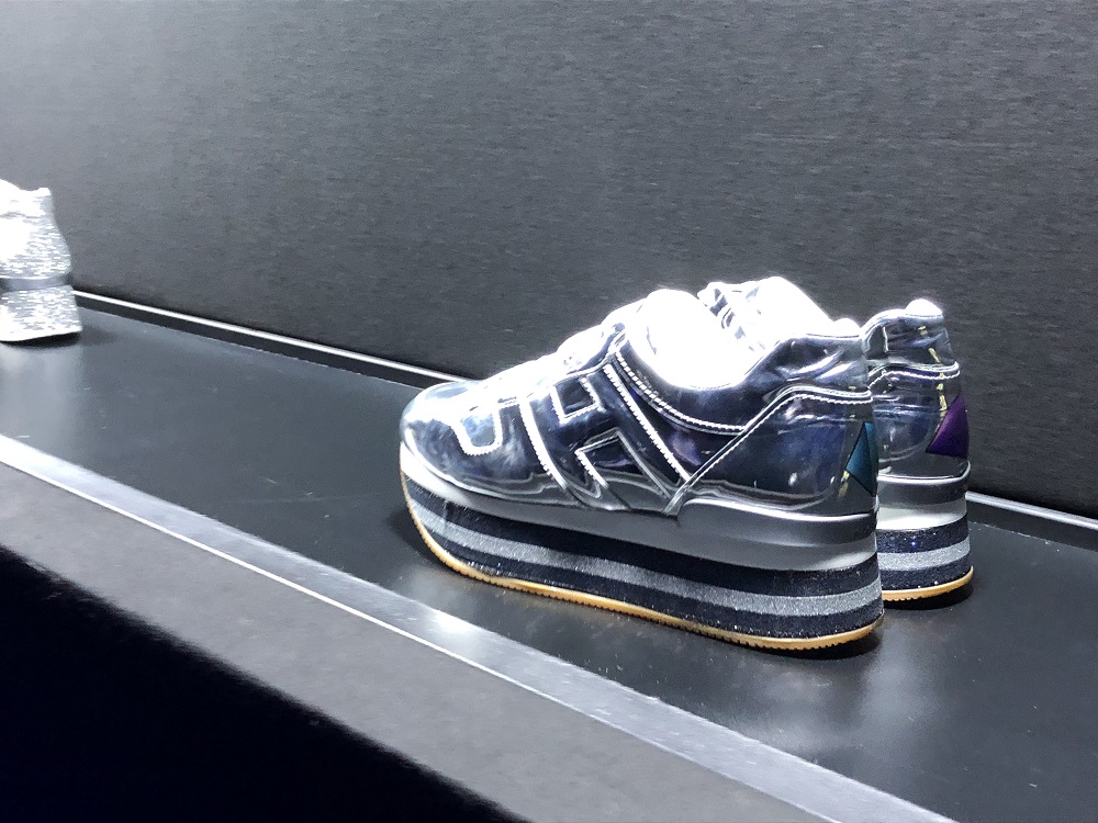 L’energia, accompagnata da musiche avvolgenti, corre e dinamizza mentre un tapis roulant che “butta fuori” senza sosta scarpe tecniche nei diversi materiali prende tutta per sé l’attenzione degli ospiti.