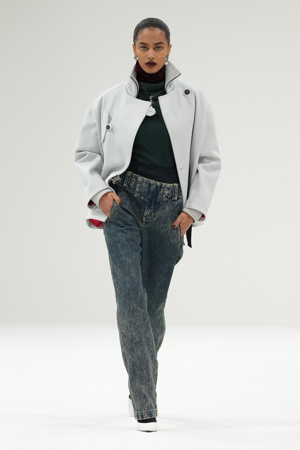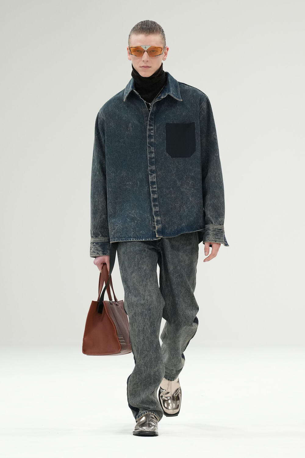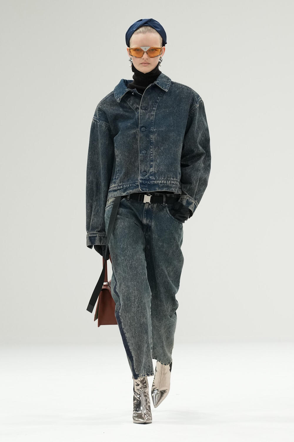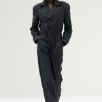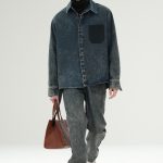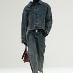 Nella sequenza dei capi in denim -che non convince molto-, il tessuto ha un aspetto usurato, come le tute del lavoro in officina, grazie a trattamenti speciali del tessuto. I pantaloni jeans accompagnano anche giacche e spolverini molto eleganti. I completi pantaloni e giacca lasciano pensare ad un utilizzo, in realtà poco probabile, per la giornata di lavoro in ufficio.