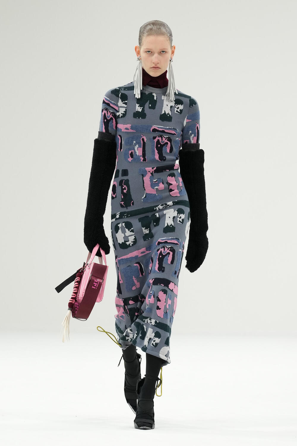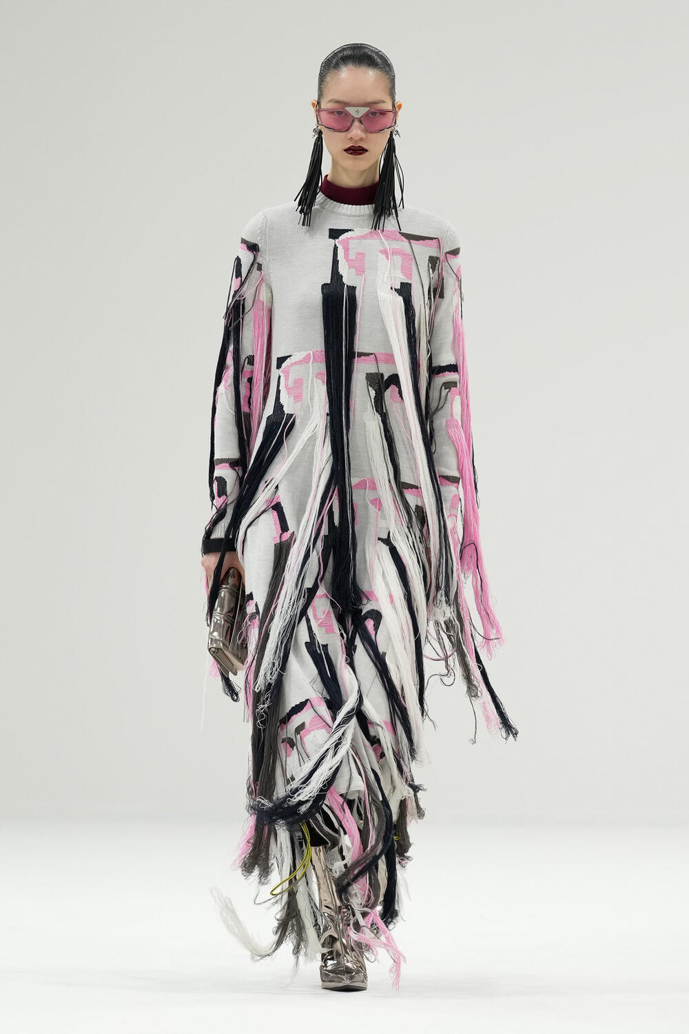 La maglieria si è presentata in passerella ornata da lunghe frange tanto su abito alla caviglia per lei o maglioni per lui, e porta su grossi maglioni riprodotto e scomposto il nome Ferrari.
