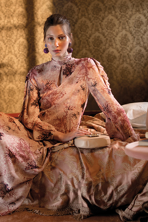 La terra d’Oriente, le stampe coi draghi, i colli delle piccole bluse a coreana, i lievi e quasi leziosi dettagli, i colori dei tramonti sul Gange e l’eleganza simbolica dei Sari.