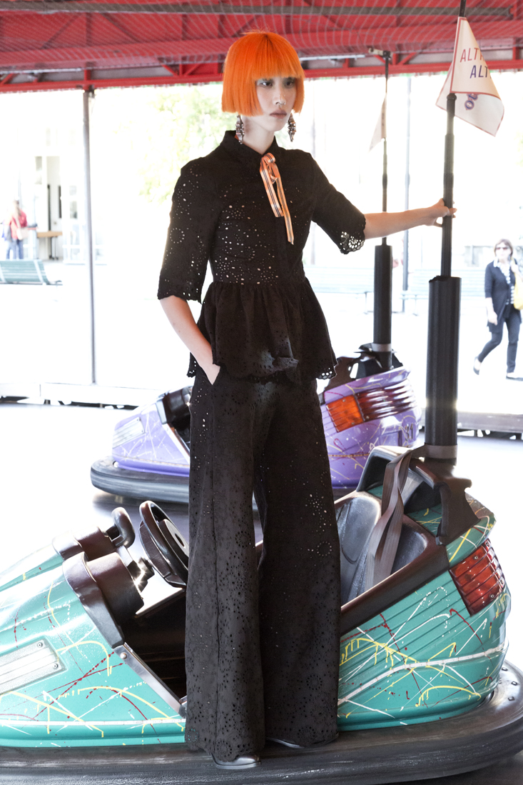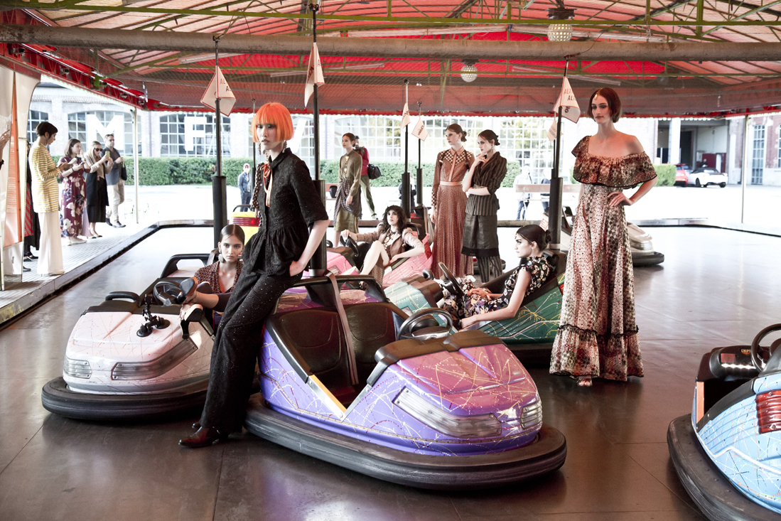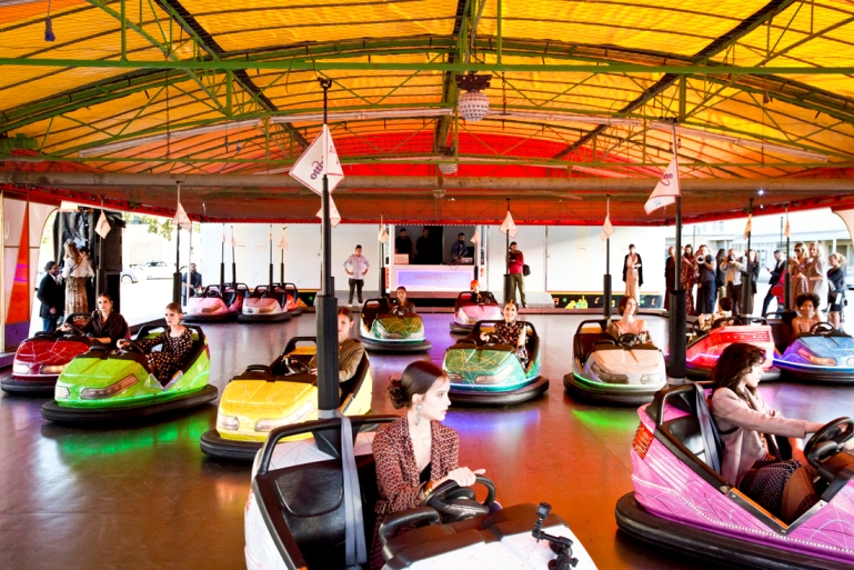 Nello spazioso cortile della Fabbrica del Vapore, composito luogo milanese di grande fascino recuperato da un’area industriale dismessa e adibito a eventi culturali di vario tipo, ci ha accolto una vera e propria pista di autoscontro. La musica diffusa dagli altoparlanti, le lucine tipiche da lunapark, le piccole automobili occupate da sorridenti indossatrici intente a evitare colpi troppo irruenti.