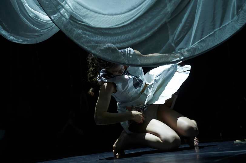 In breve, in cosa consiste questa performance sui generis? Mentre sul palco Mukaiyama in abito da sera iridescente suona con tocco delicato un pianoforte a coda, i ballerini si svestono lentamente, con movimenti sofferti. Alla fine restano solo con indosso una sottile tuta color nudo. Poi, ad un ritmo più sostenuto, si muovono tra il pubblico, incedendo con eleganza, quasi a simulare una sfilata in passerella. Inizia appunto una sfilata in cui i danzatori, emergendo dal buio, vestono riproduzioni di abiti e accessori cool appoggiandoli sul corpo. I movimenti dignitosi e flessuosi diventano però sempre più goffi e strambi, parodiando le movenze di modelle e modelli durante i defilé. La scena si conclude con una parata di attori in tuta accademica, ognuno dei quali interpreta un proprio ruolo, richiamando il portamento di pedoni che camminano frettolosamente sui marciapiedi metropolitani. Cala di nuovo il buio e quando torna la luce appare una ballerina che comincia a tagliare con una grande forbice l’abito di carta indossato, mentre sul fondale si palesano le silhouette degli altri performer, chiusi in un vestito a sacco di colore nero cangiante. Lo spettacolo si conclude con la stessa Tomoko Mukaiyama che si posiziona sotto un fascio di luce in un tubo-rete. Un’opera suggestiva, non c’è che dire.