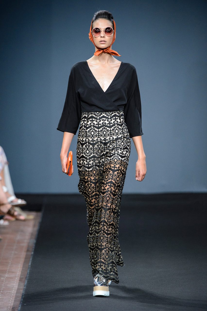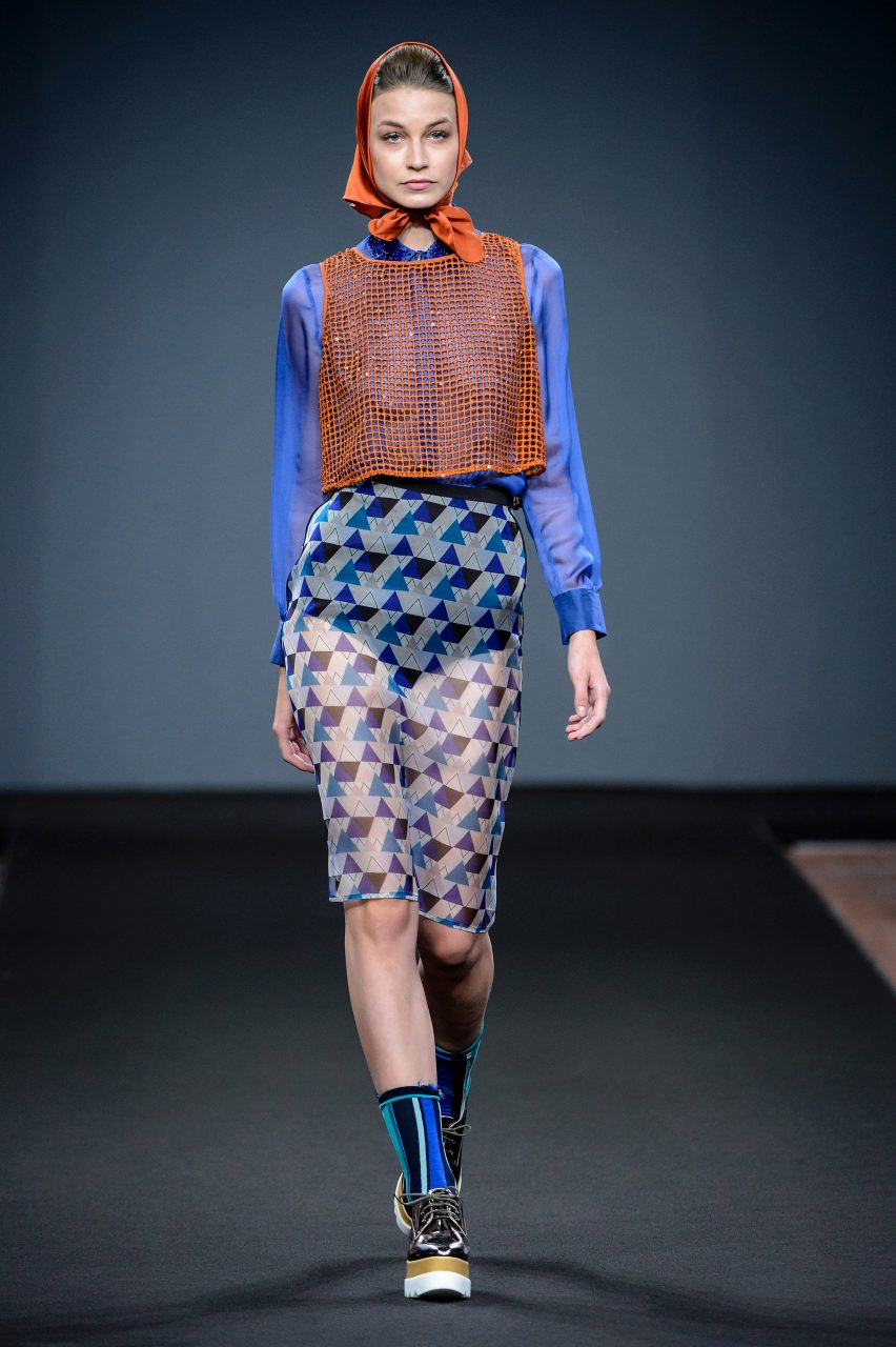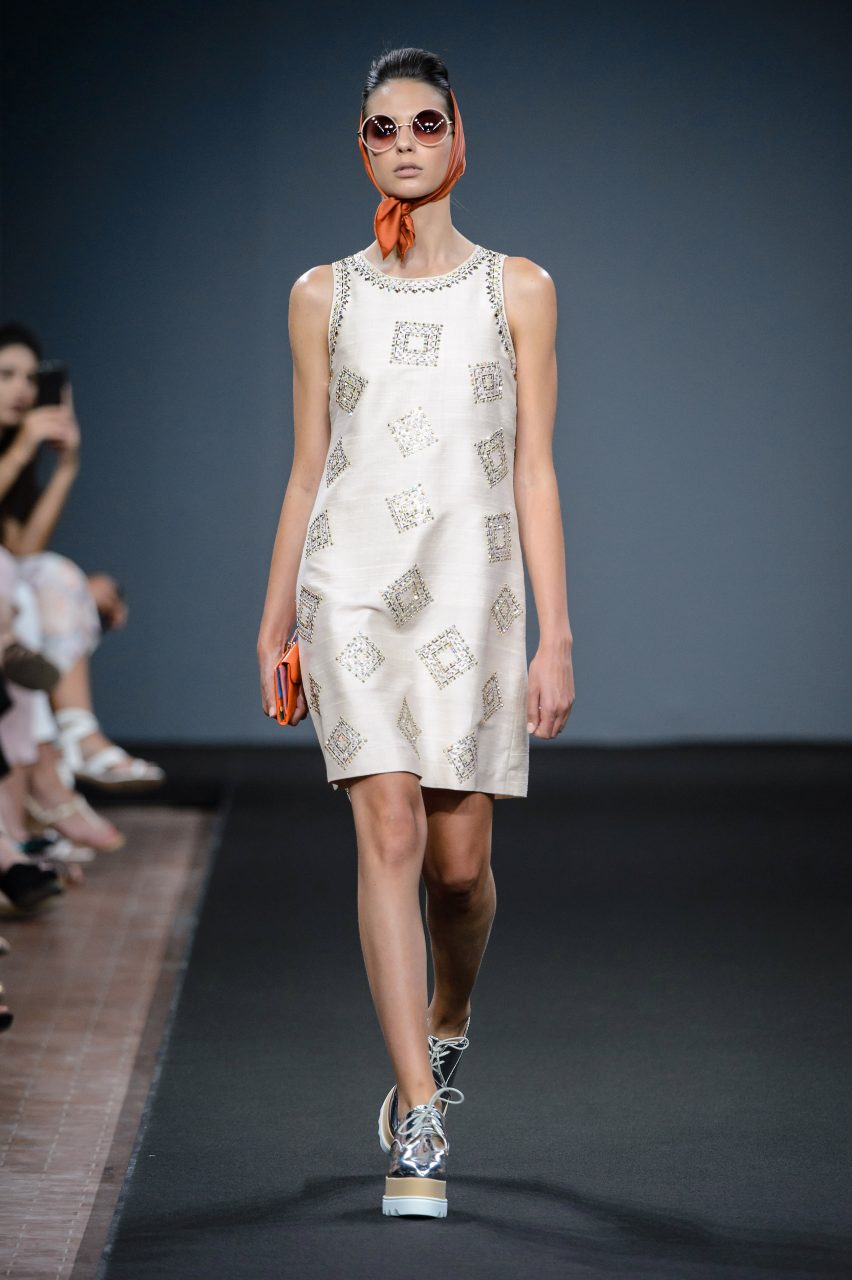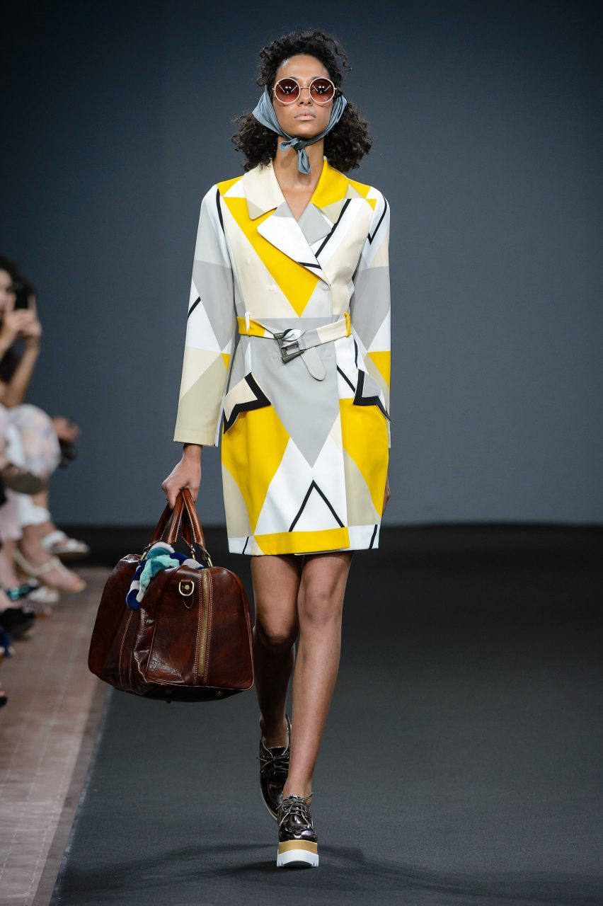 Generose le stampe geometriche e le geometrie delle linee. Divertenti, tipici e spiritosi i foulard annodati sotto il collo, un piccolo dettaglio a ricalcare le intenzioni della stilista di ancorarsi al passato senza per questo dimenticare di re-interpretarne i codici.