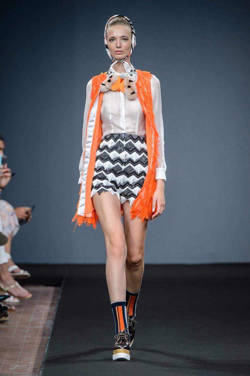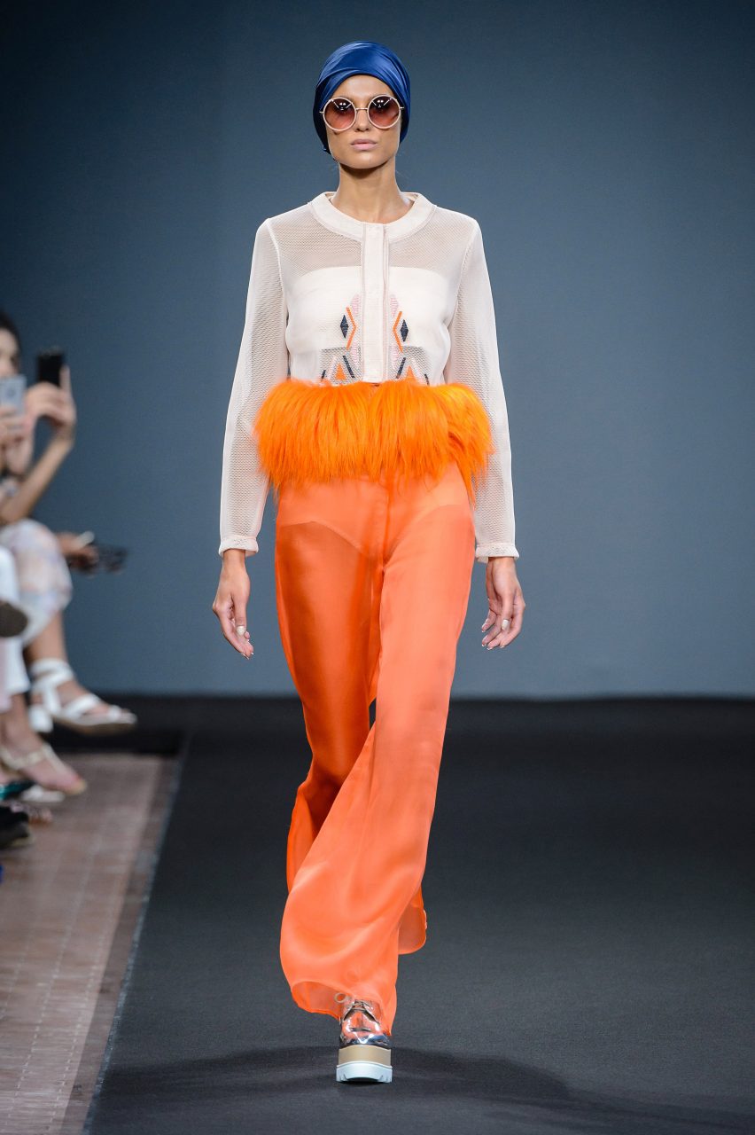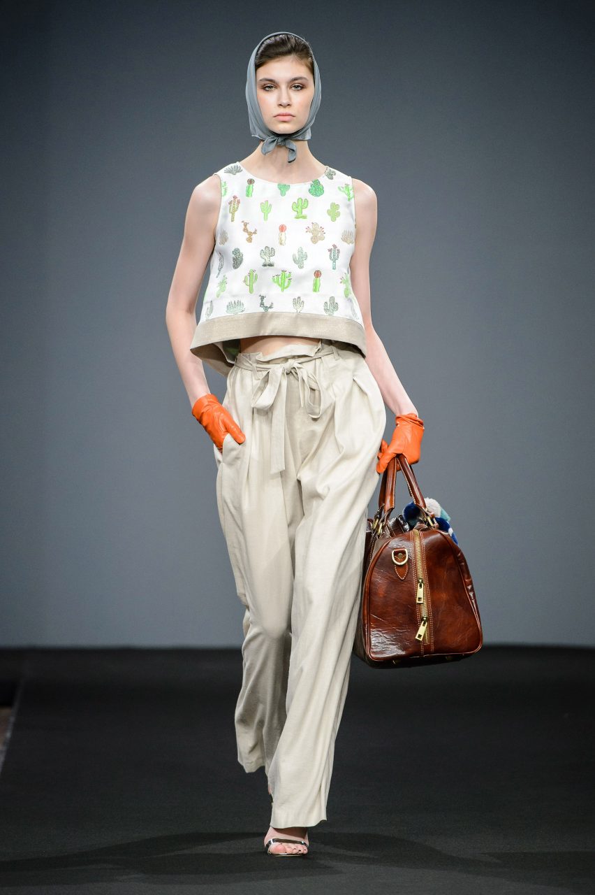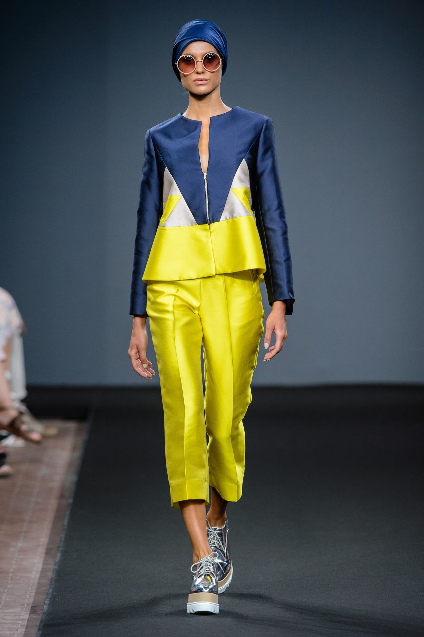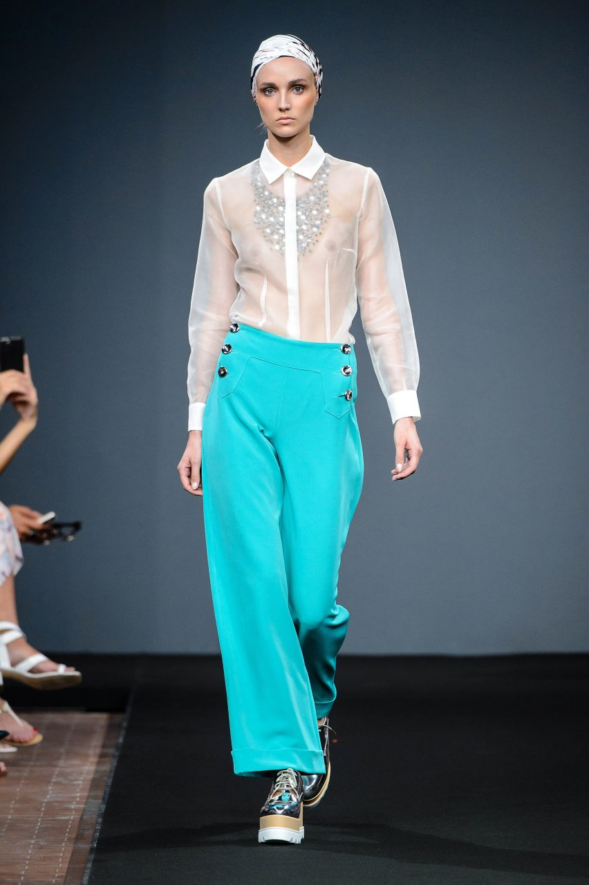 Generose le stampe geometriche e le geometrie delle linee. Divertenti, tipici e spiritosi i foulard annodati sotto il collo, un piccolo dettaglio a ricalcare le intenzioni della stilista di ancorarsi al passato senza per questo dimenticare di re-interpretarne i codici.