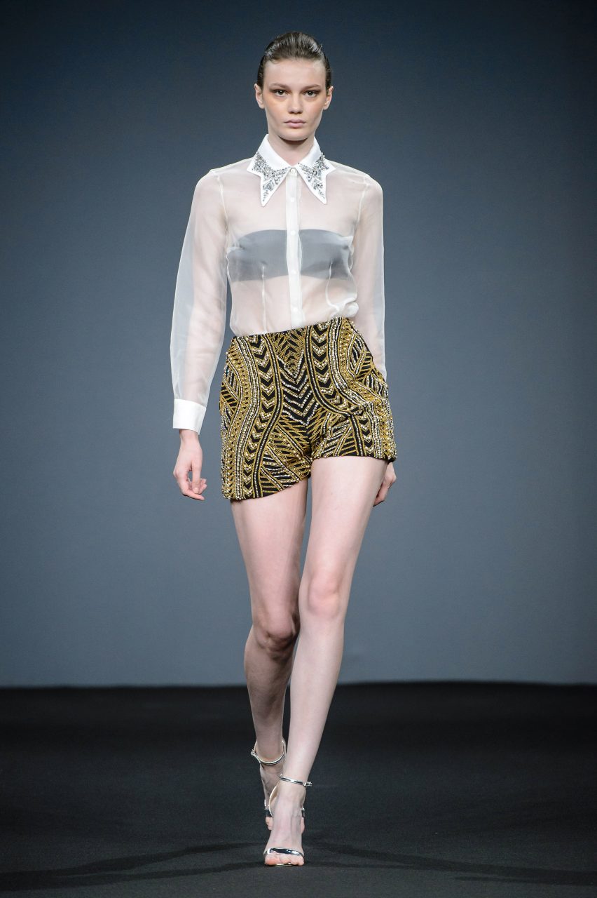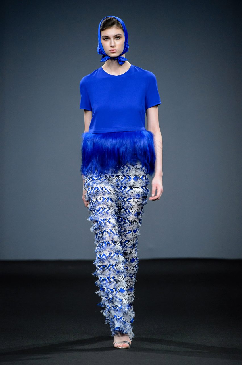 Le superfici delle stoffe si increspano, sono sfilacciate e talvolta tagliuzzate; dettagli di piume cingono vite sottili, e piccoli bomber sovrastano mise rigorose. Molti i pezzi iconici, broche, gioielli indossati sotto bluse trasparenti, colletti con giochi di fiocchi sovrapposti, bijoux e maxi ricami geometrici. Assolutamente coerenti con quanto espresso, le linee a trapezio per gli abitini dalle spalle scoperte in perfetto stile Jackie e i trench svasati, dal punto vita ben segnato e dagli scolli ariosi. Ma anche, i pantaloni fluidi a vita alta sormontati da camicine in voile di seta dotate di originali colletti ricamati nonché le femminili gonne dritte e al ginocchio indossate con piccoli giubbini dalla tempra moderna .