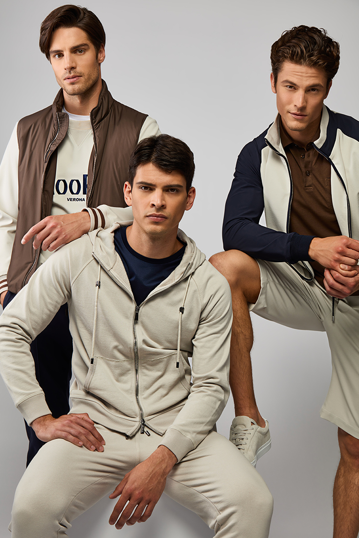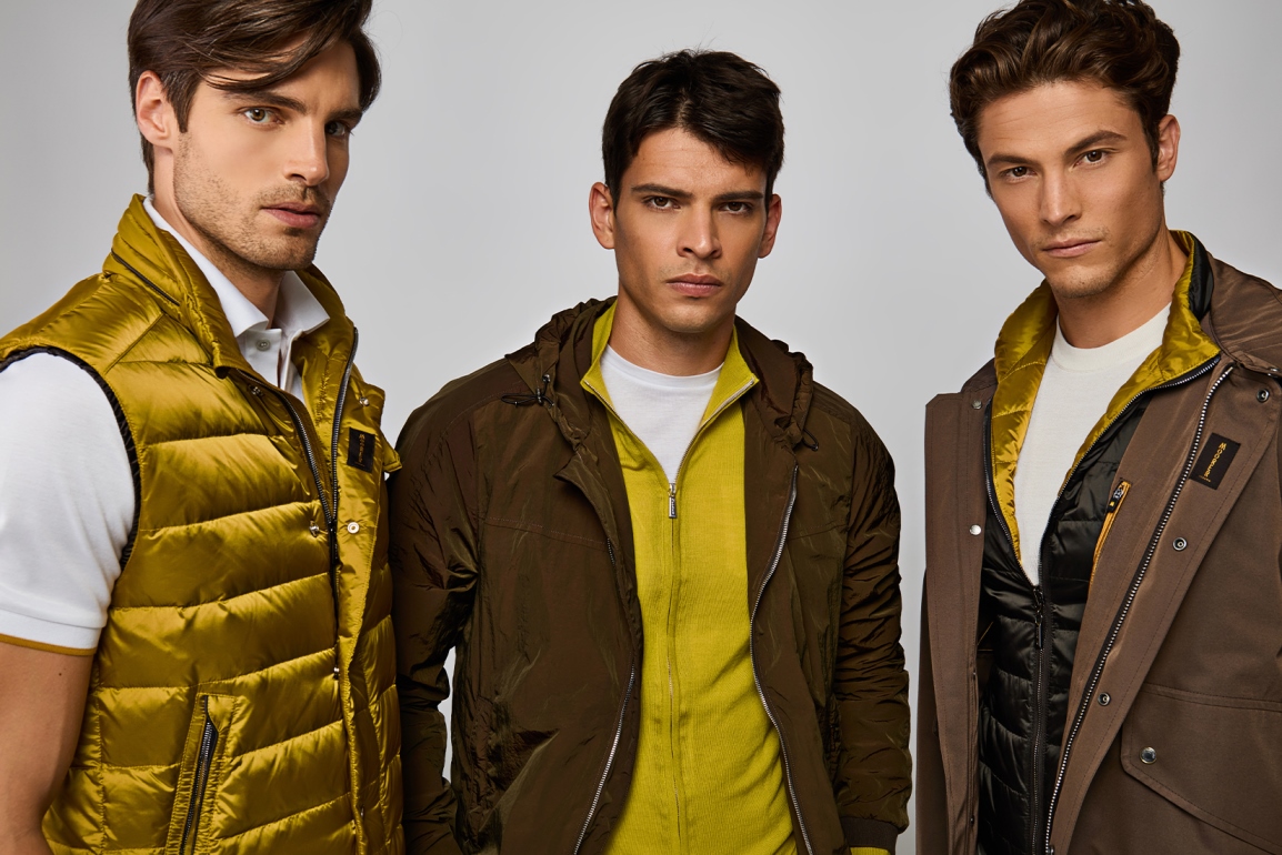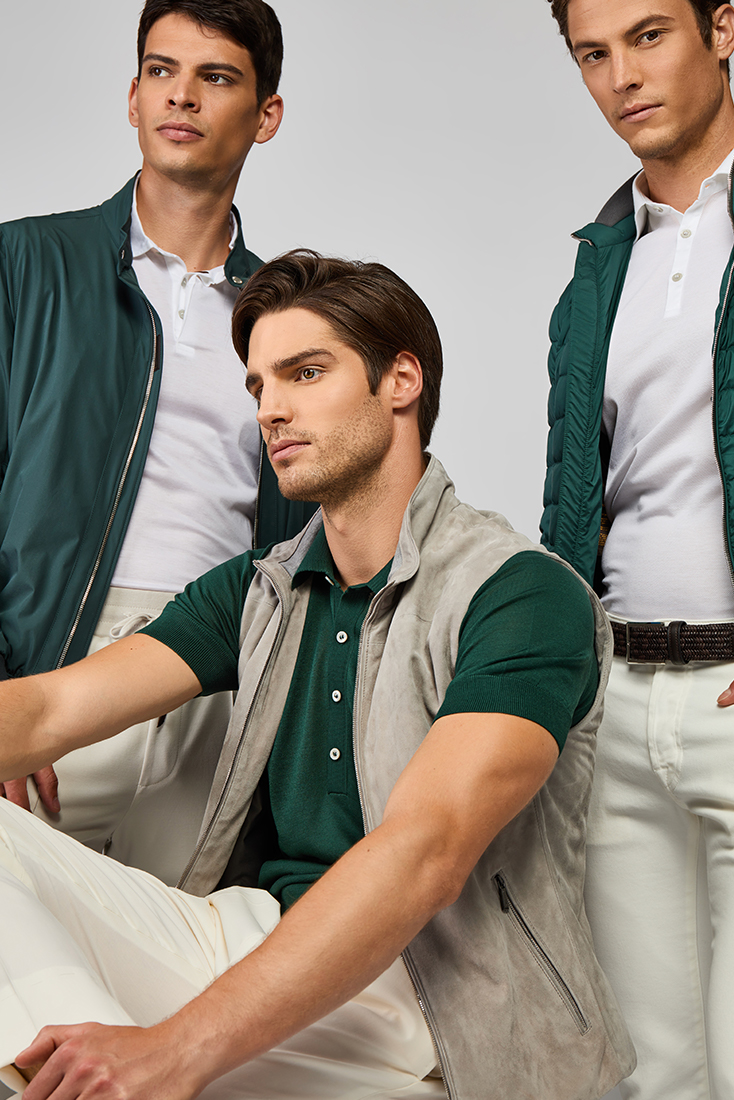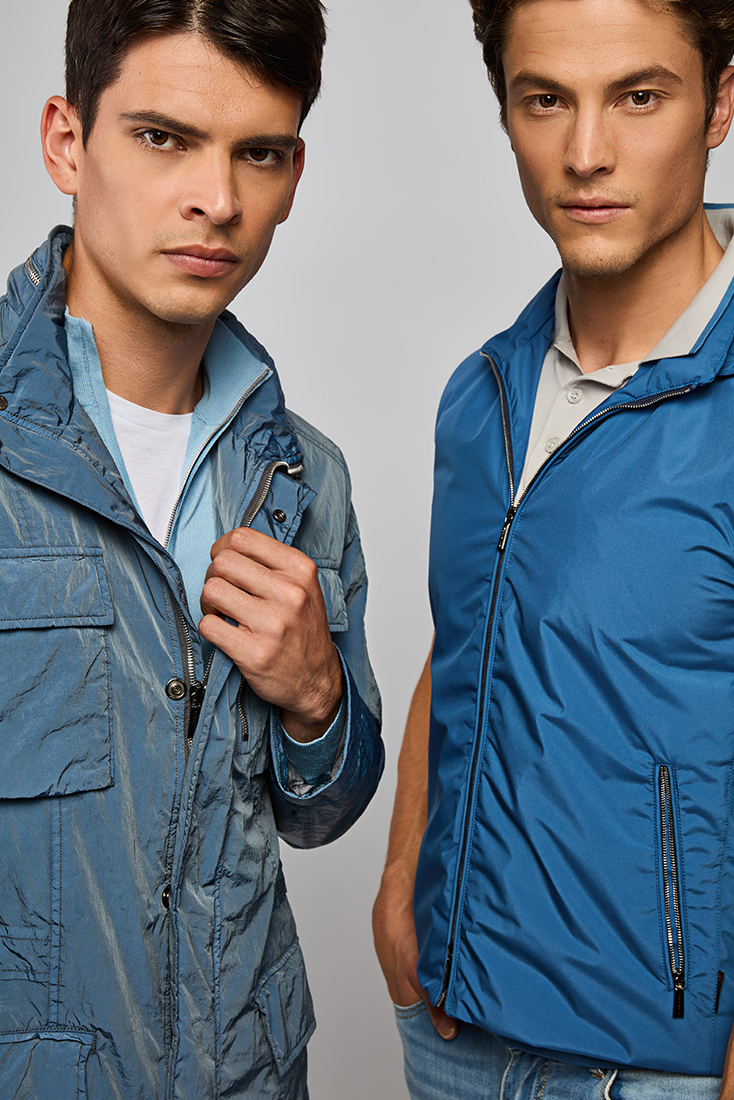 Una collezione molto studiata, composta non solo di giacche, bomber e gilet imbottiti di piume d’oca- per le vacanze in montagna, ma anche di capi più leggeri in tessuti impermeabili, fino ai bermuda e t-shirt, golf e cardigan bianco/blu adatti ad una partita sui campi da golf, gilet trapuntati, bomber in denim. Niente è lasciato al caso, per regalare appunto uno stile impeccabile anche nei momenti informali della vita: quel lavaggio particolare del denim per renderlo più morbido, quei dettagli addirittura nascosti, i cappucci nel collo, le tasche portadocumenti celate all’interno, la doppia chiusura con zip e bottoni, le rifiniture delle tasche magari chiuse semplicemente con zip ma arricchita di una bordura, bottoni a chiodo in metallo brunito, ecc, ecc.