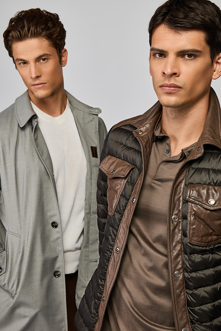 Un classico bomber, un pezzo iconico della collezione MooRER, trapuntato con una leggera piuma d’oca, adatto quindi alla stagione primaverile; grandi tasche e inserti in jeans mentre il collo, l’elastico in vita e i polsini sono in maglia bicolore. L’interno è interamente foderato con pratiche tasche porta documenti e rifiniture con fettuccia logata. La chiusura frontale con bottoni a chiodo in metallo brunito lo rende sportivo ma sofisticato.