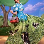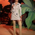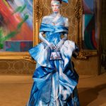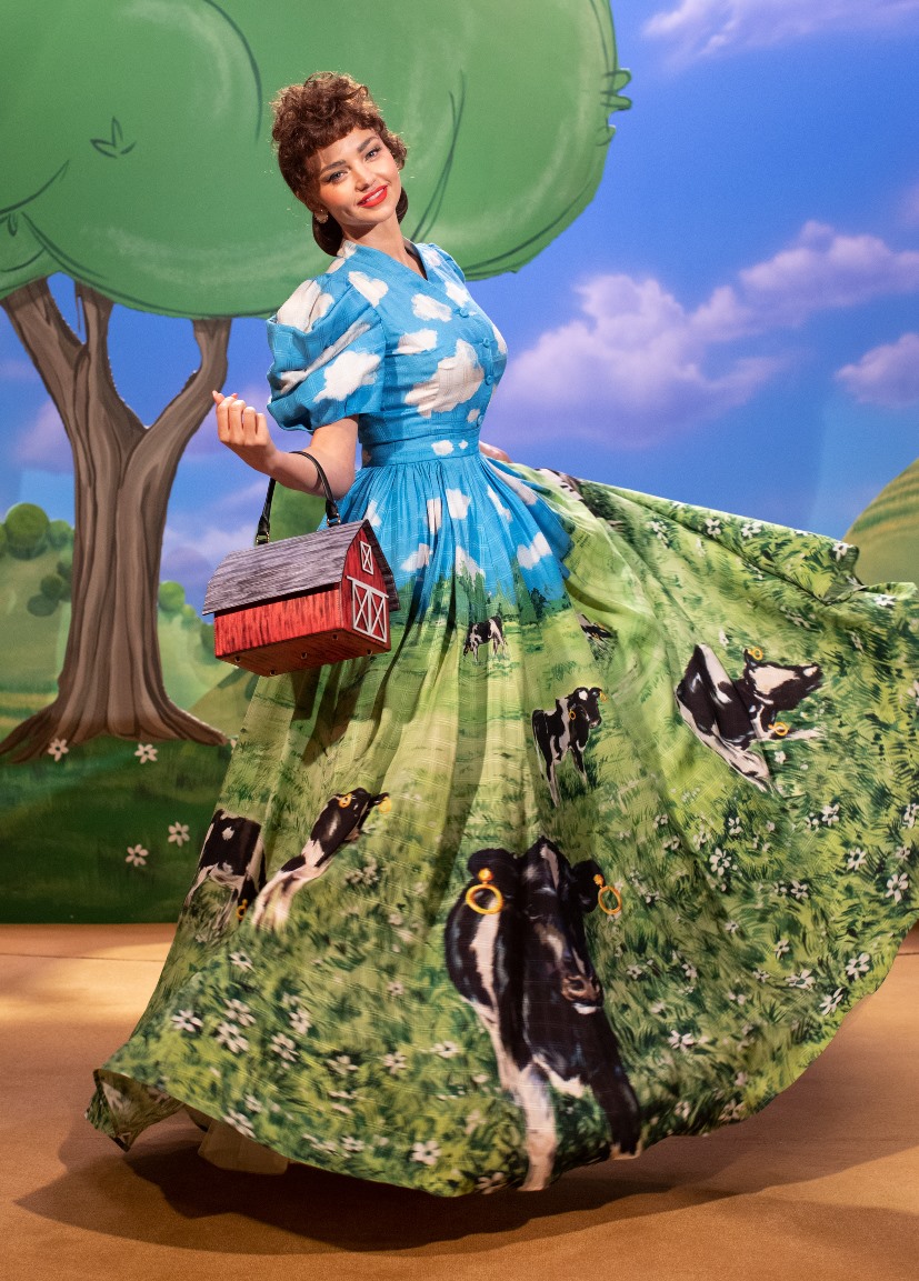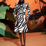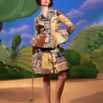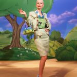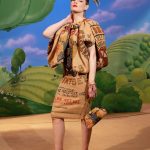 Poi lo scenario diventa bucolico, un paesaggio campestre di stampo naïf , dove ben si collocano i capi con mucche stampate, ironico elemento iconico di Moschino. Il rustico sacco delle patate nelle mani di Jeremy Scott diventa tessuto lavorato a fiocchi e sbuffi in divertenti capi di abbigliamento, eleganti per quanto assurdi e il tailleur quasi-chanel che merita uno stupefacente copricapo che riporta l’immaginazione alle Grandi Pianure degli Stati Uniti.