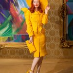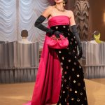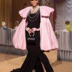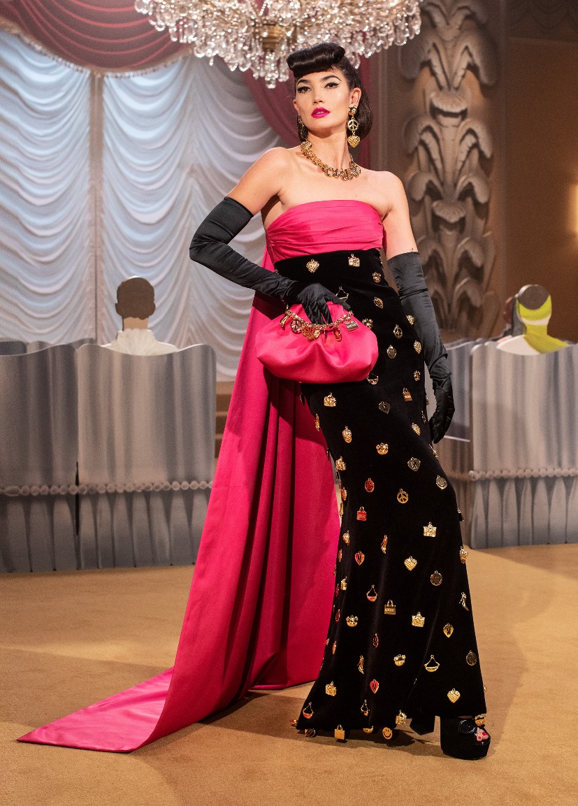 Ecco che il direttore creativo di Moschino con la sua verve impertinente si ispira a questa commedia, chiama la sua collezione Jungle Red e addirittura si permette di imbastire uno show che con pungente ironia rappresenta, non solo l’alta borghesia di New York, ma anche il mondo hollywoodiano e si concede di ironizzare -ciò però sta nel DNA del brand creato da Franco Moschino, che Jeremy Scott ha ben assimilato- sulle assurdità che la moda è in grado di imbastire, come a suggerimento di non prenderla troppo sul serio. Basterebbe solo menzionare l’abito coccodrillo di squame dorate a cui non manca una lunga e micidiale coda, ed anche quello rosso dell’ inquadratura finale dello show, cosparso di cuori neri, a cui il nostro direttore creativo ha, con un colpo di forbice, eliminato un cerchio di stoffa per lasciare a vista il candido sedere della modella; oppure si tratta -sarebbe una nota ironica ancora più pungente- di una applicazione di tela che lo riproduce? La visione dello show non ci permette di definirlo.