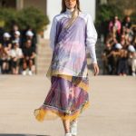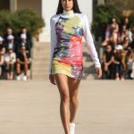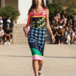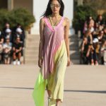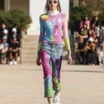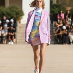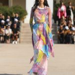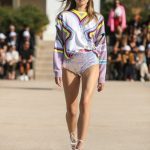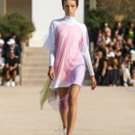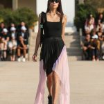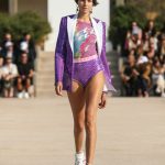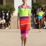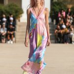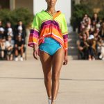 La musica accompagna un ondeggiare tra capi da sport deluxe e sexy -short sgambati a vita alta indossati con top che rimandano alle immagini di atlete-, e maxi abiti in tulle stampato, gonne e pantaloni arricchiti di una “pinna”plissettata o rivestiti di paillettes. Già dalla prima uscita -bell’abito lungo multicolor con una plissettatura sovrapposta in cintura, sagomata a pinna che svolazza quasi potesse aiutare la modella ad avanzare sul bordo piscina,cogliamo l’ immagine di una sirena.
