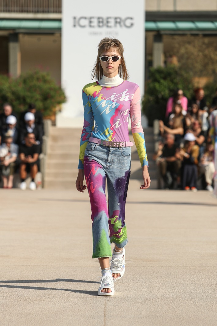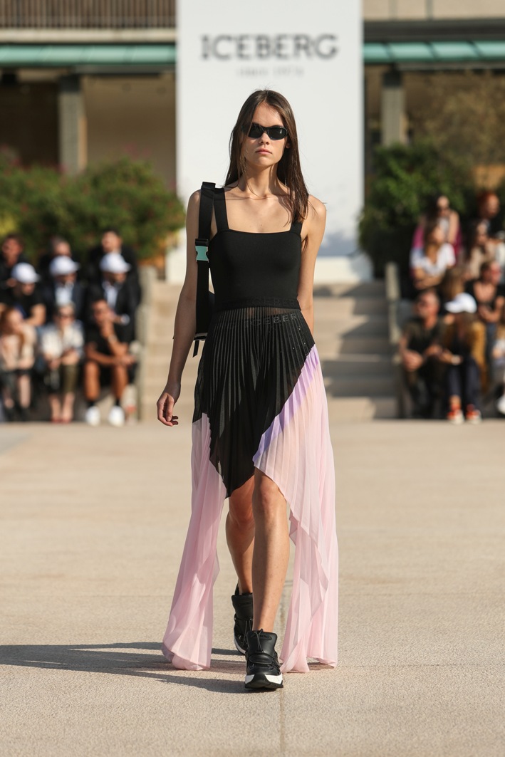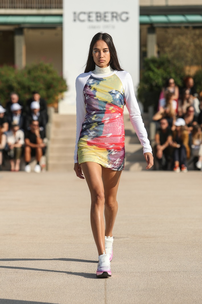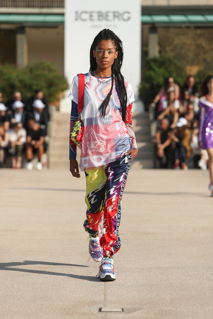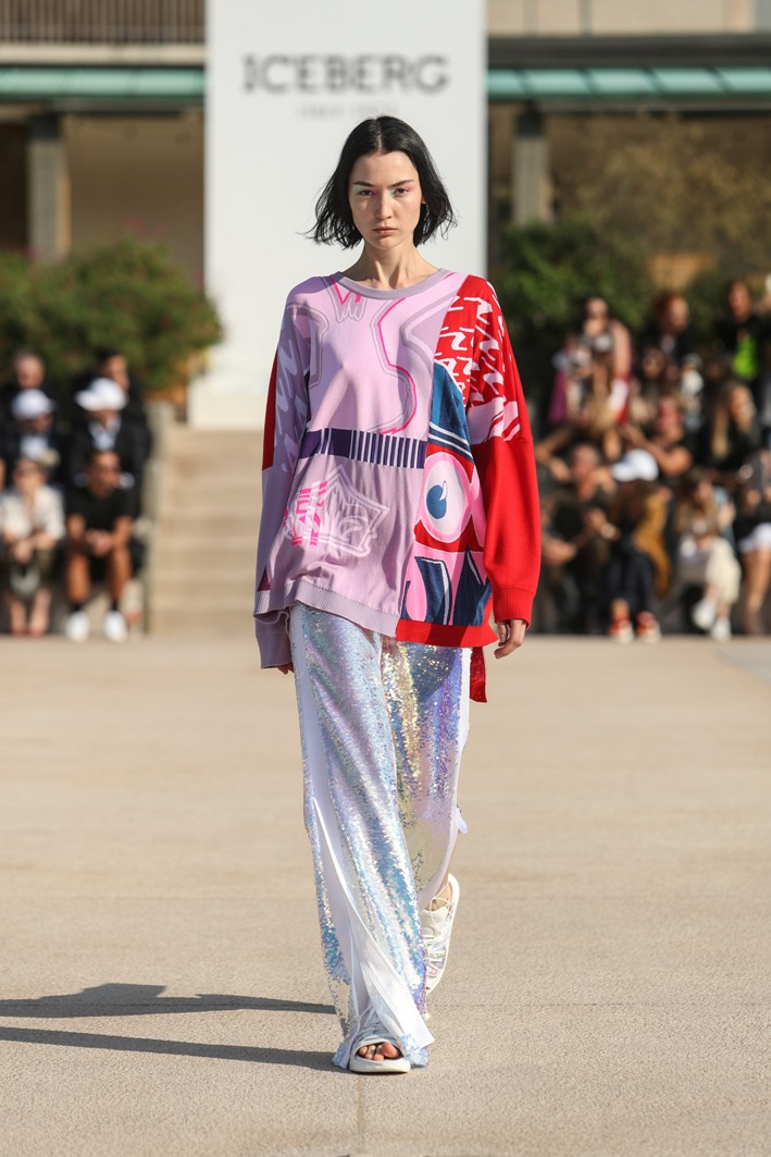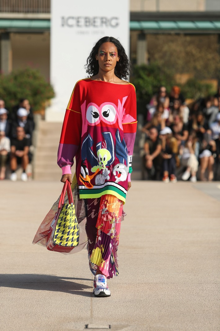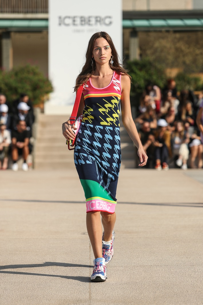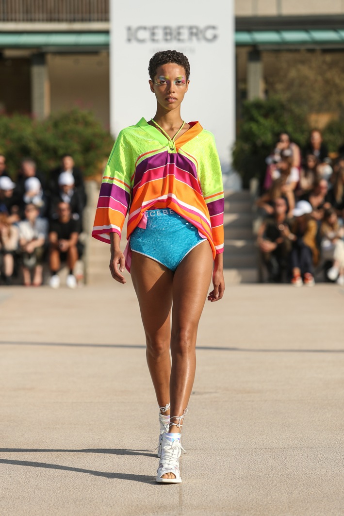 Quindi una donna a suo agio in ogni ambiente – terraferma, acqua- quella che il Direttore creativo James Lang ci propone; una donna con grinta che osa molto nel suo abbigliamento. Indossa abiti stile rash guard,maglioni cartoon con stampe dei Looney Tunes; belle stampe multicolori geometriche e astratte su tessuti leggeri o meno;una donna che rivela un autentica logomania vestendo capi firmati più volte ICEBERG, dove la “I” di Iceberg è ripetuta all’infinito. Chiudono la collezione, a sorpresa, una serie di abiti total black o block-color nero e rosa.