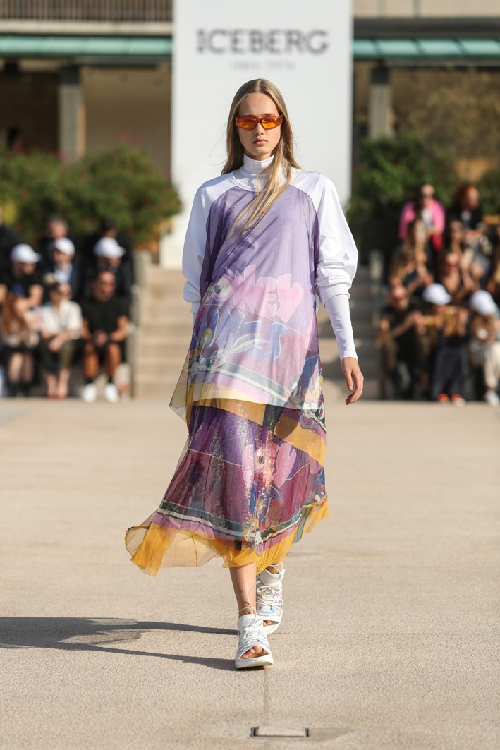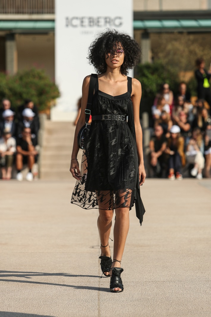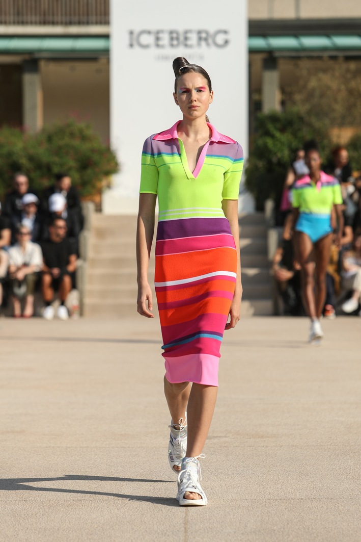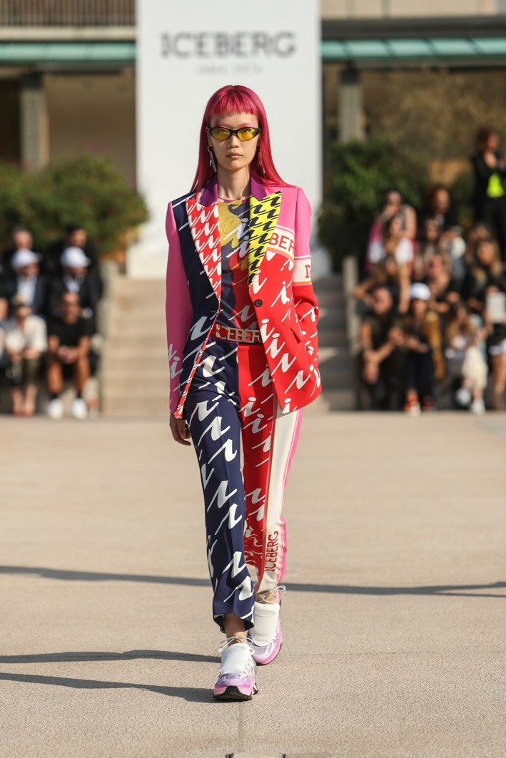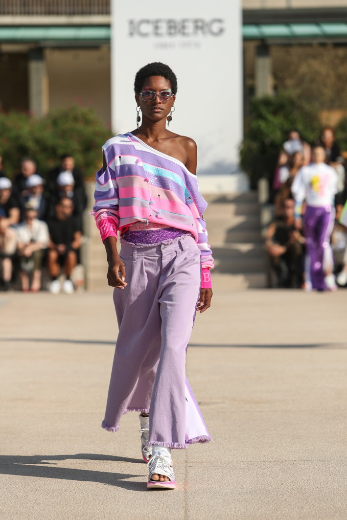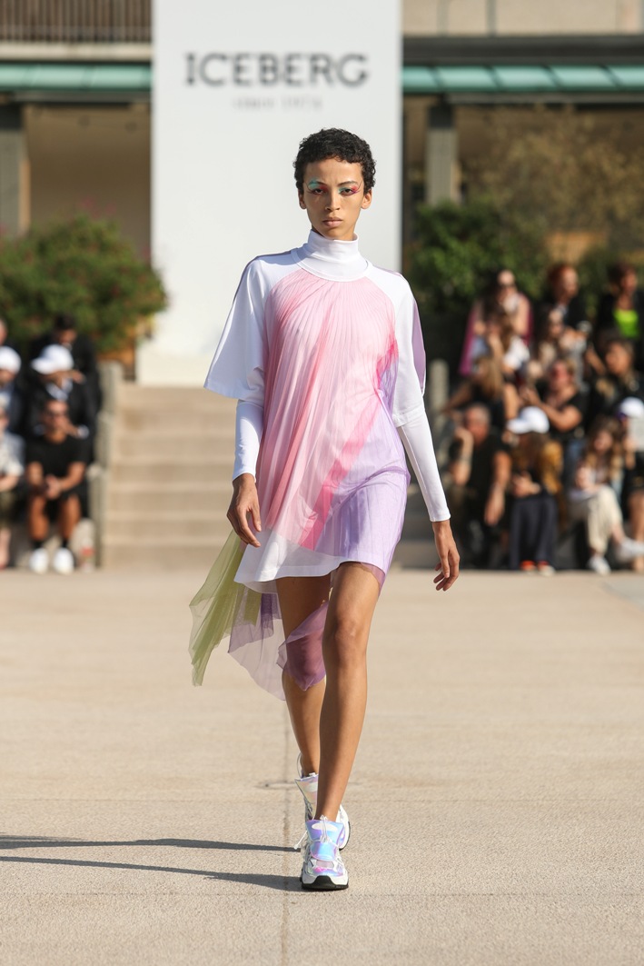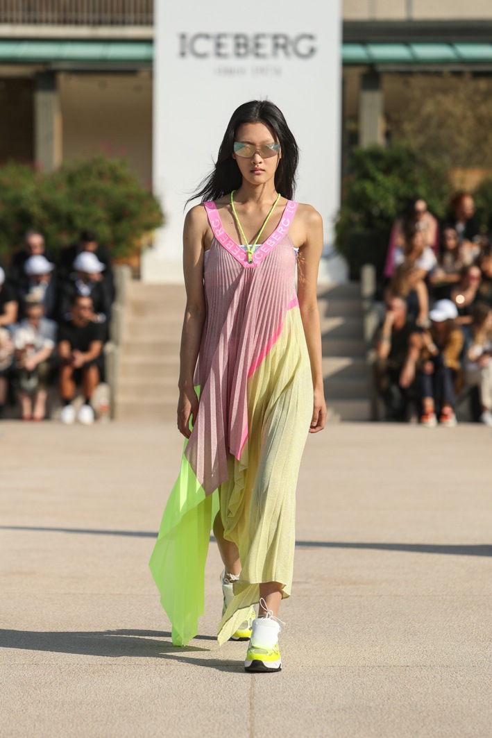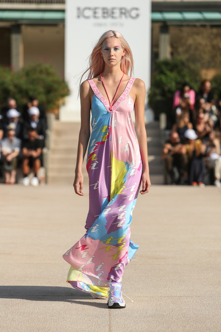 Quindi una donna a suo agio in ogni ambiente – terraferma, acqua- quella che il Direttore creativo James Lang ci propone; una donna con grinta che osa molto nel suo abbigliamento. Indossa abiti stile rash guard,maglioni cartoon con stampe dei Looney Tunes; belle stampe multicolori geometriche e astratte su tessuti leggeri o meno;una donna che rivela un autentica logomania vestendo capi firmati più volte ICEBERG, dove la “I” di Iceberg è ripetuta all’infinito. Chiudono la collezione, a sorpresa, una serie di abiti total black o block-color nero e rosa.