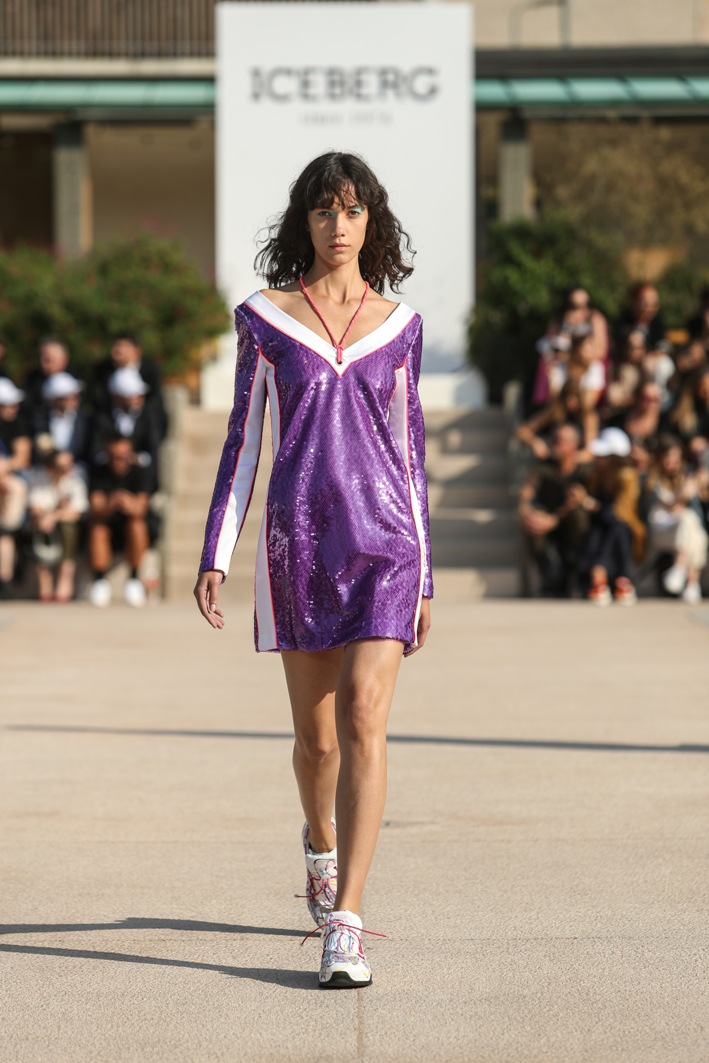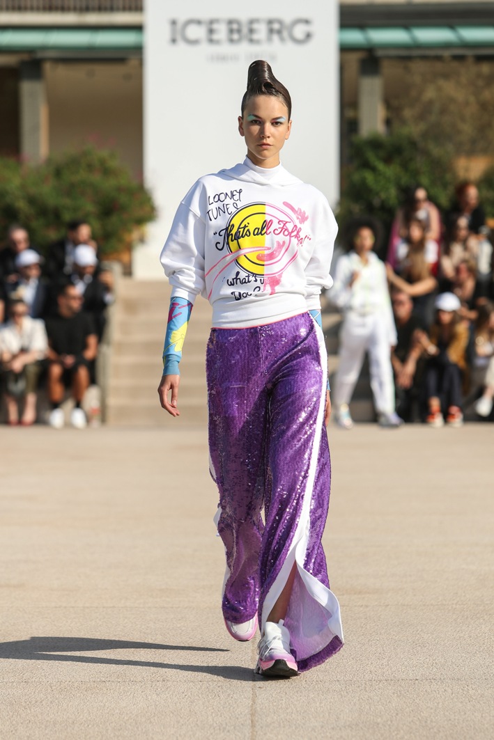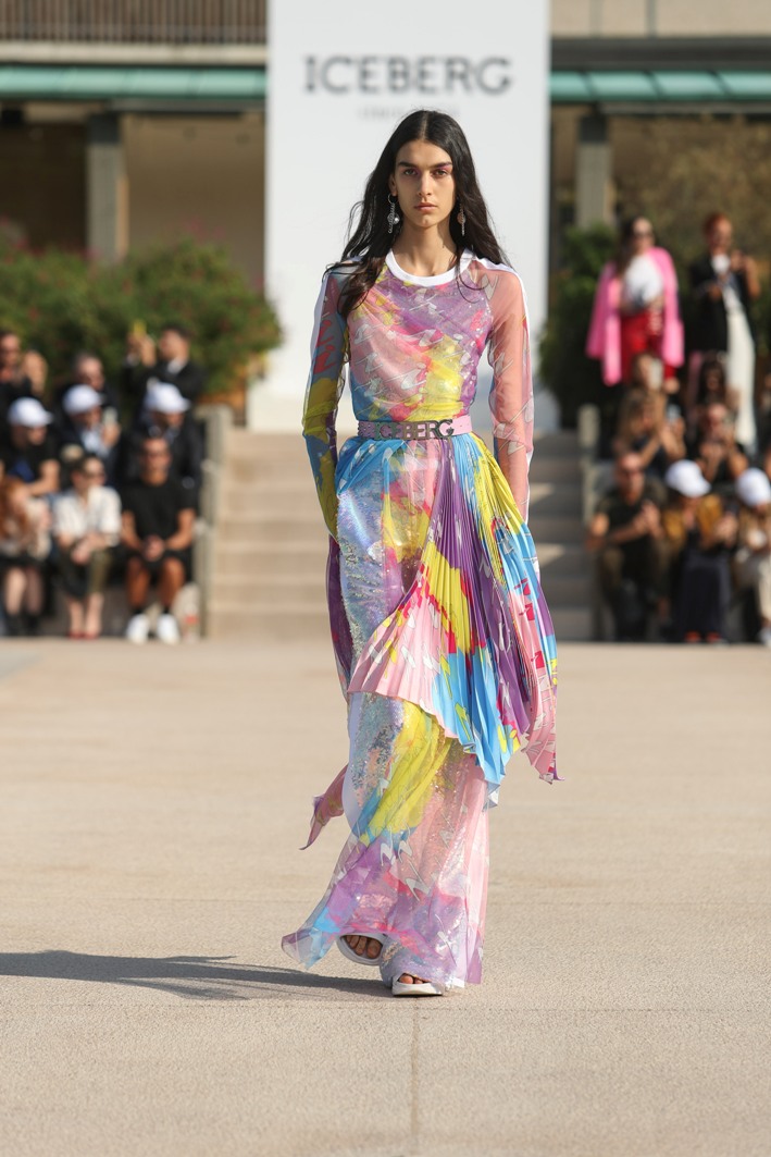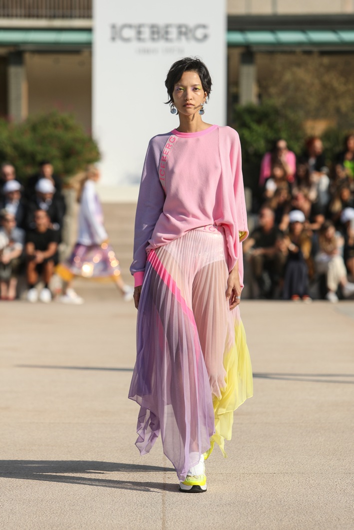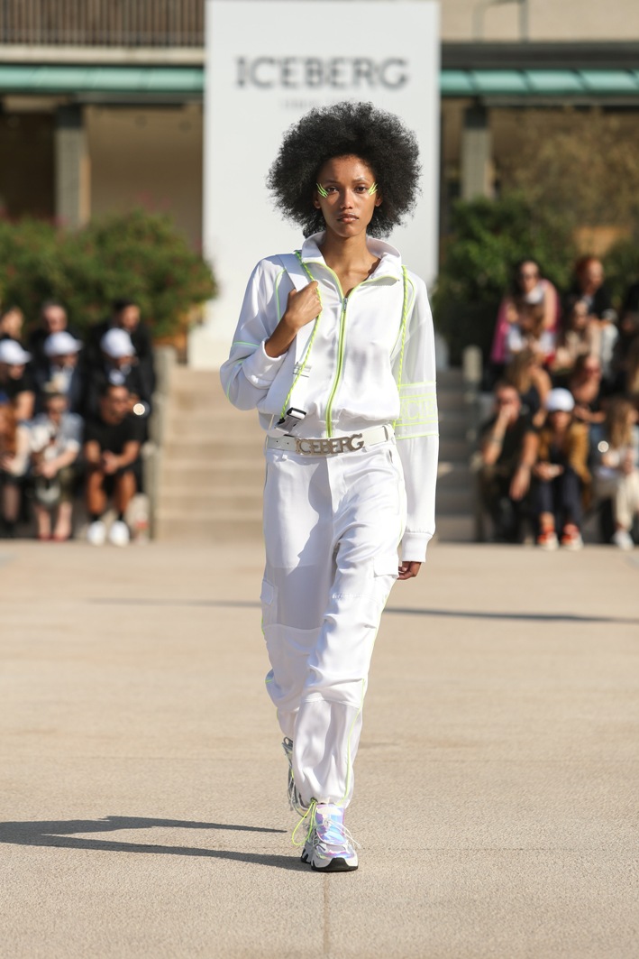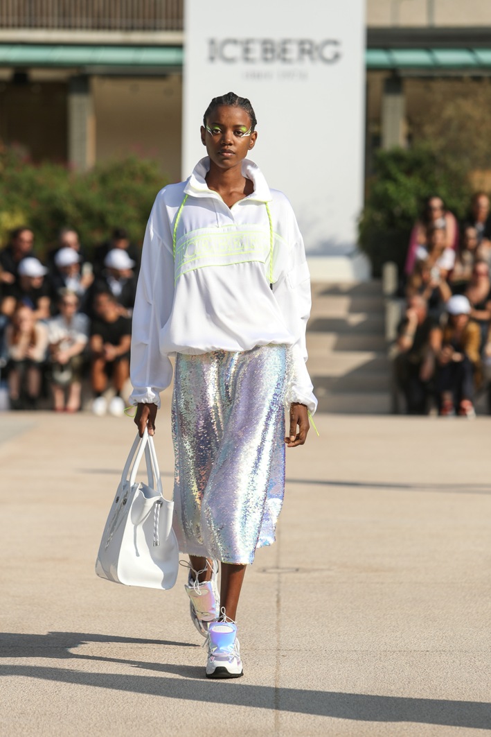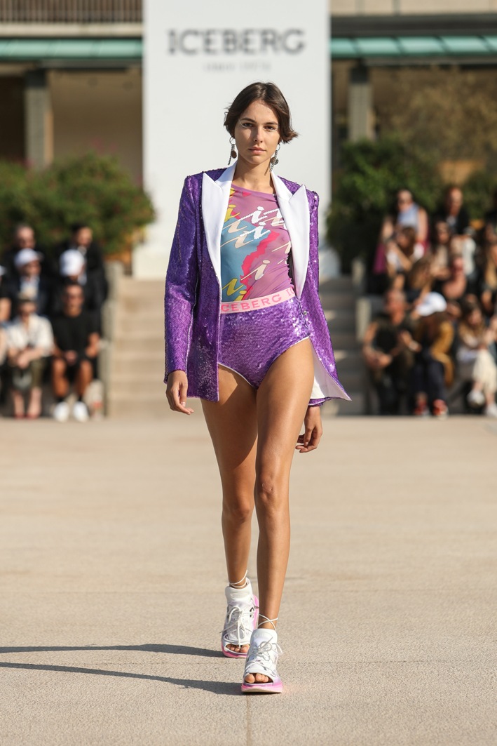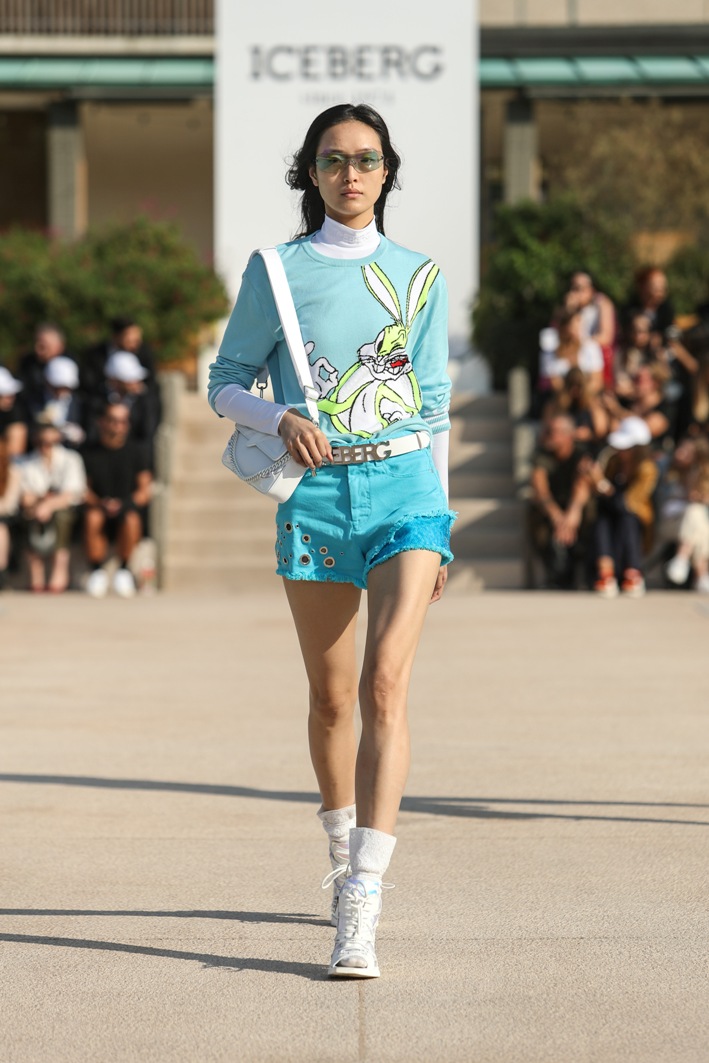 Quindi una donna a suo agio in ogni ambiente – terraferma, acqua- quella che il Direttore creativo James Lang ci propone; una donna con grinta che osa molto nel suo abbigliamento. Indossa abiti stile rash guard,maglioni cartoon con stampe dei Looney Tunes; belle stampe multicolori geometriche e astratte su tessuti leggeri o meno;una donna che rivela un autentica logomania vestendo capi firmati più volte ICEBERG, dove la “I” di Iceberg è ripetuta all’infinito. Chiudono la collezione, a sorpresa, una serie di abiti total black o block-color nero e rosa.