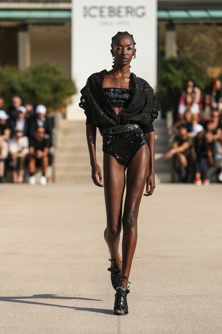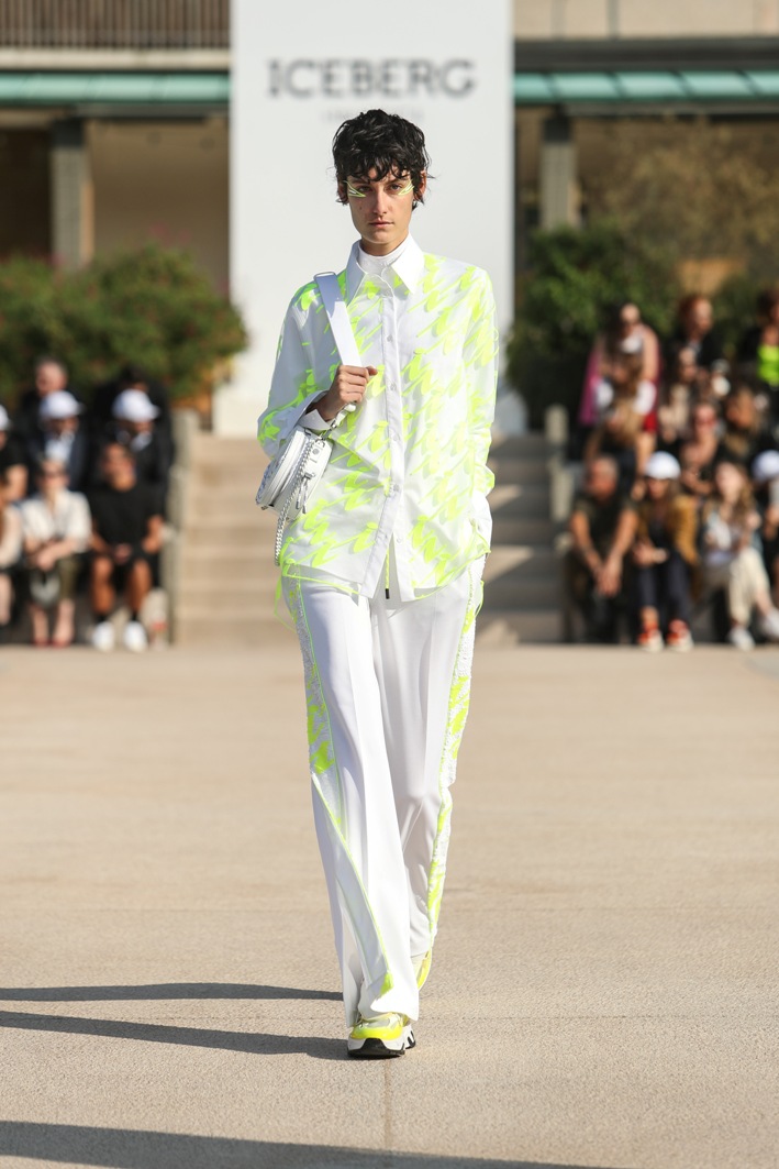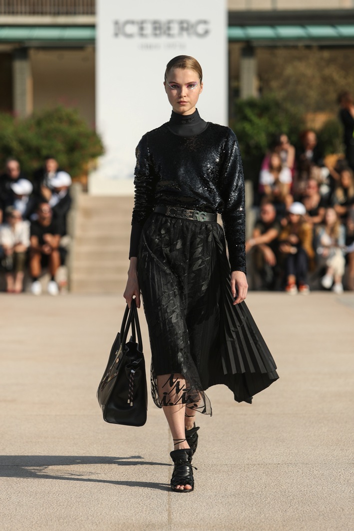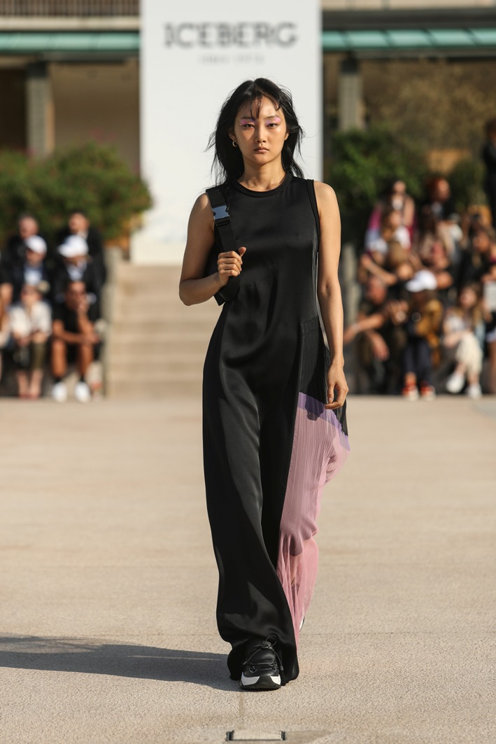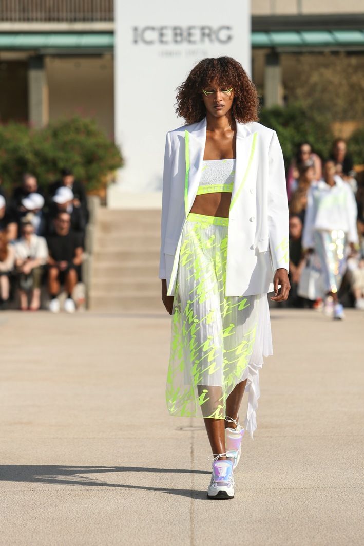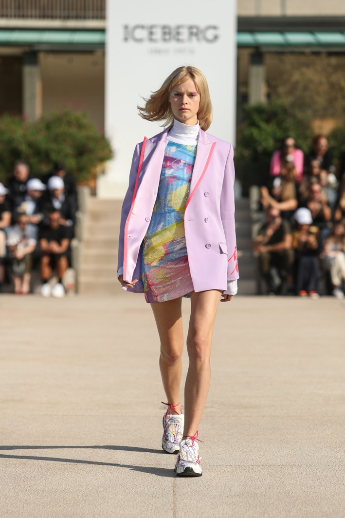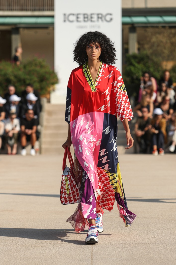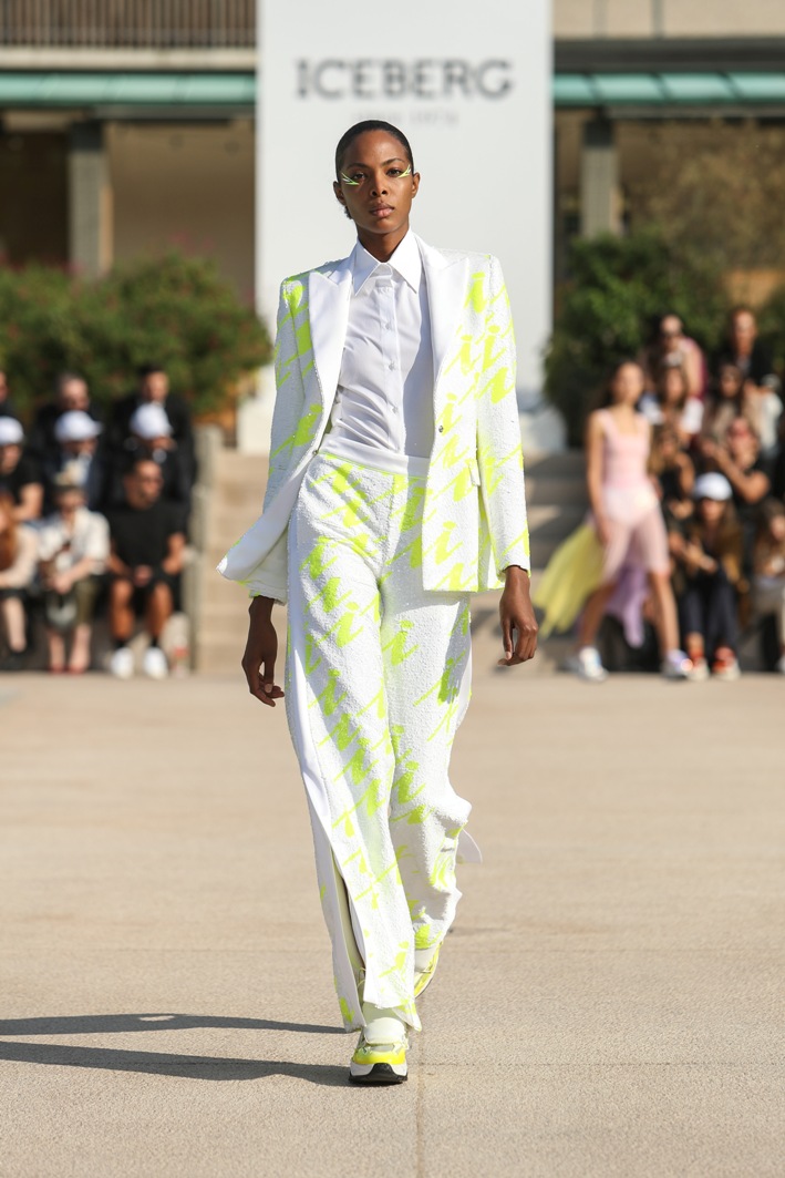 Quindi una donna a suo agio in ogni ambiente – terraferma, acqua- quella che il Direttore creativo James Lang ci propone; una donna con grinta che osa molto nel suo abbigliamento. Indossa abiti stile rash guard,maglioni cartoon con stampe dei Looney Tunes; belle stampe multicolori geometriche e astratte su tessuti leggeri o meno;una donna che rivela un autentica logomania vestendo capi firmati più volte ICEBERG, dove la “I” di Iceberg è ripetuta all’infinito. Chiudono la collezione, a sorpresa, una serie di abiti total black o block-color nero e rosa.