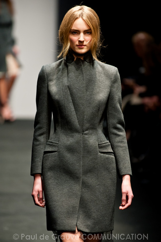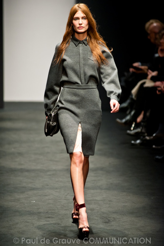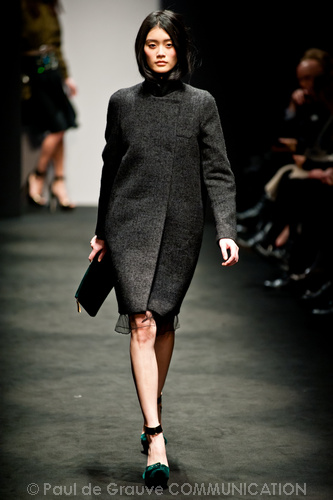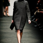 Potremmo continuare a commentare gli scombinamenti, ma ci piace invece segnalare due momenti felici della collezione. I due cappotti grigi uno linea ad A, l’altro dalla vita segnata e linea leggermente a uovo.