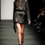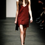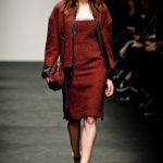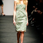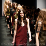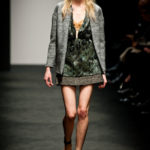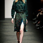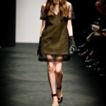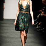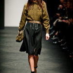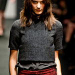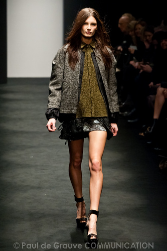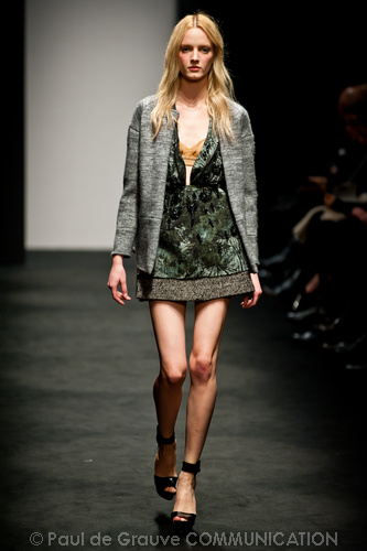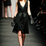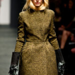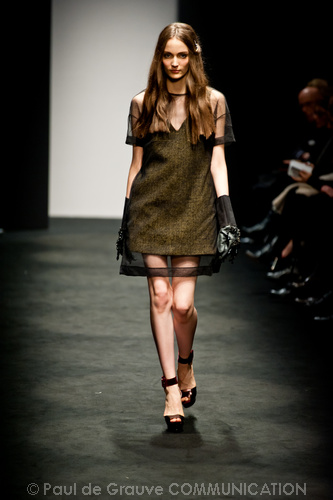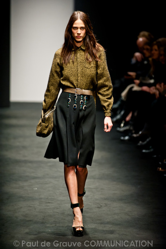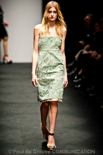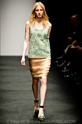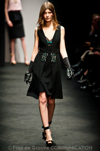 Ci sembra invece di riconoscere una immagine di donna capricciosa e un po’ sciatta -i capelli delle modelle ci suggeriscono questa interpretazione-, che si “diverte” o si “impunta” a voler a tutti i costi rompere le regole del ben vestire anche se indossa abiti di un “costoso” vestire. Allora la gonna ricamata e la camicia macramè verde petrolio sono sdrammatizzate da una cintura da uomo; e l’abito ricamato sempre con rustica cintura lascia intravedere il reggiseno, una “sciatteria” femminile ripetuta in tanti outfit che –troppo l’abbiamo vista per strada- oramai non raggiunge più la soglia della sensualità e rimane solo volgarità. La gonna al ginocchio color carne e il top verde pastello in macramè sembrano presi per caso dall’armadio e indossati senza pensarci molto. Volutamente sovversivo il top somigliante alla salopette di una tuta da lavoro che lascia vedere il reggiseno sottolineato da larghe spalline in evidenza. Più studiato sembra la combinazione dell’abito organza su camicia bianca e gonna in tweed accompagnati da guanti da giardinaggio neri con ricami in jais.