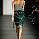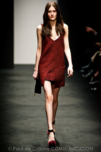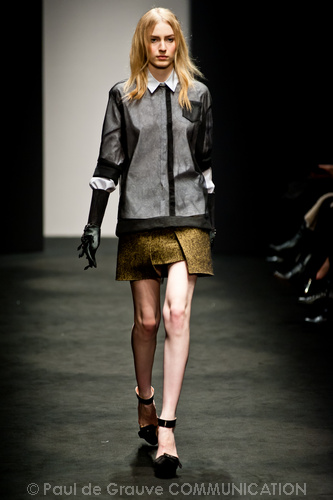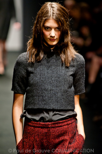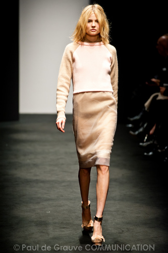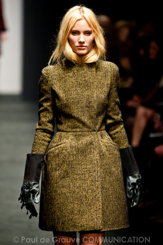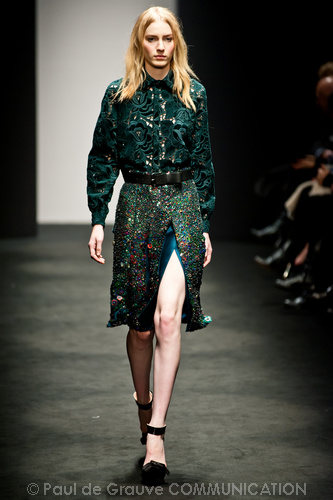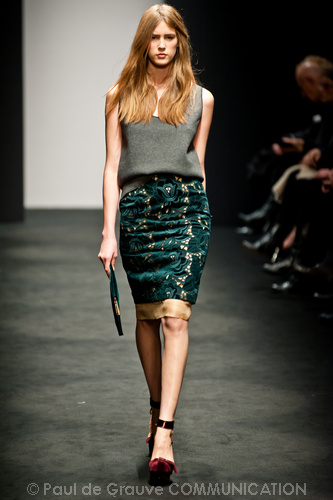 Sorprende ma non convince la collezione autunno/inverno 2012-13 N. 21 di Alessandro dell’Acqua. Lo stilista non ha timore a sovvertire le regole dello stile bon ton combinando in modo rivoluzionario i pezzi. Ma non sappiamo se prendere ciò sul serio o con ironia, e divertirci anche noi a ricombinare i pezzi in modo diverso e secondo regole diverse. Non capiamo neppure il riferimento, anche se dichiarato come molto lontano, alla Regina Elisabetta in versione privata come fonte di ispirazione: forse sta nell’uso del verde pastello spesse volte indossato dalla Regina?