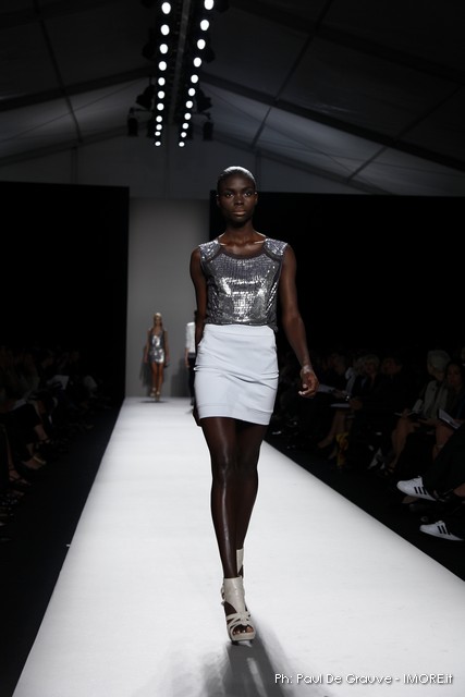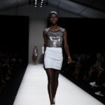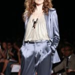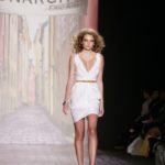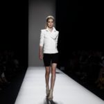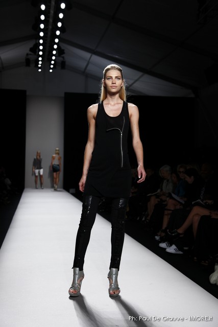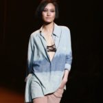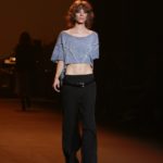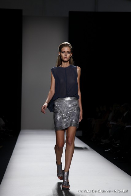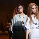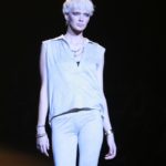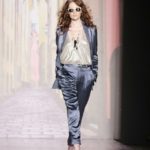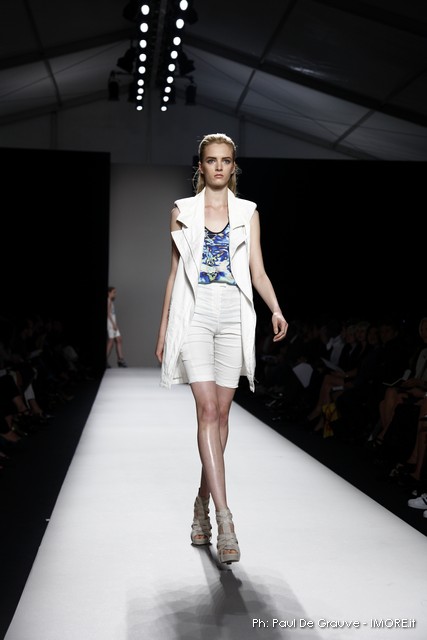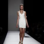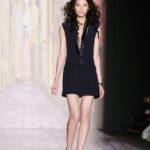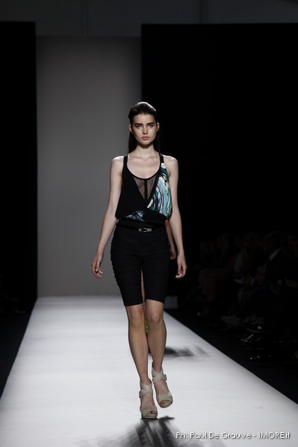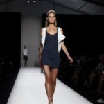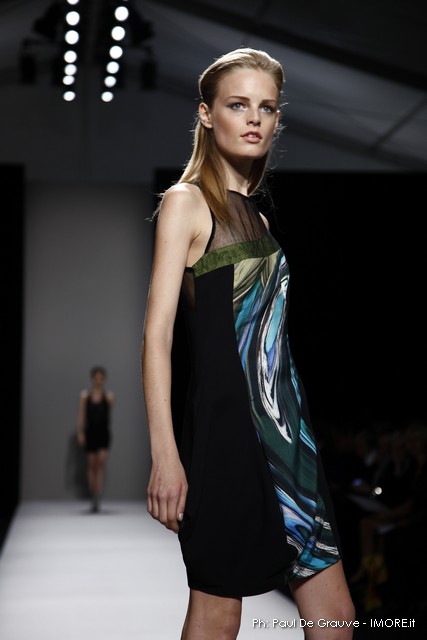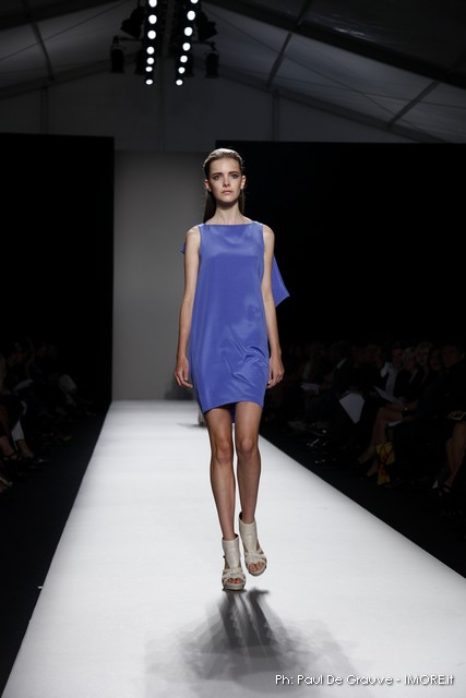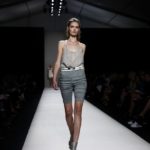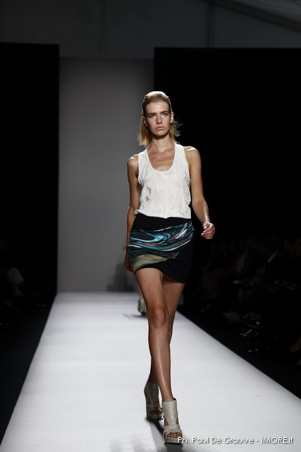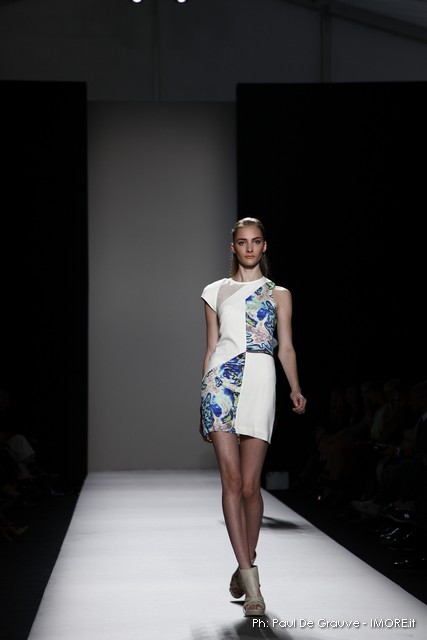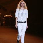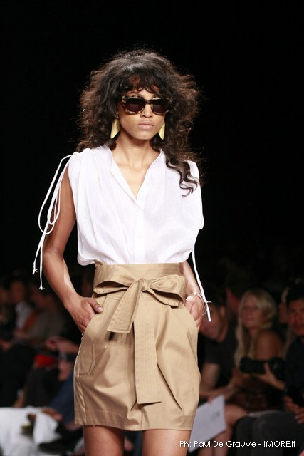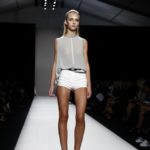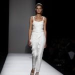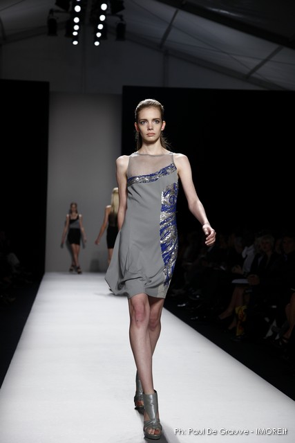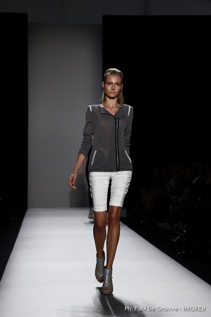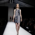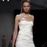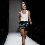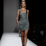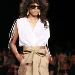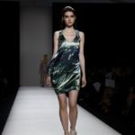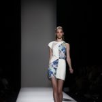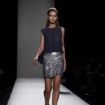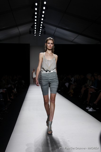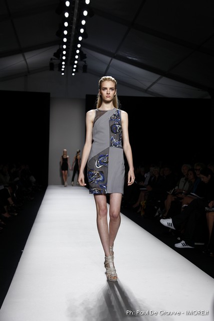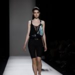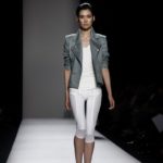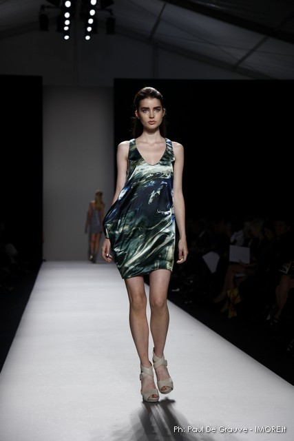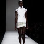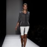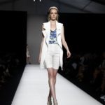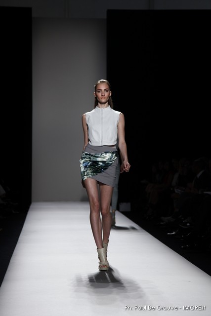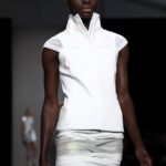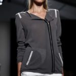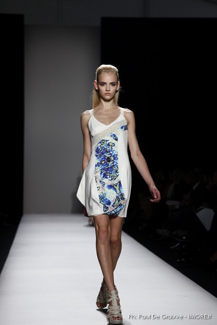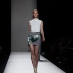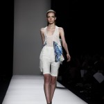 Questi motivi stampati digitalmente sono abbinati a tagli asimmetrici su tessuti come il tulle il cotone stretch e la seta. La Miller poi ha offerto diversi interpretazioni di pantaloncini, come quelli da ciclista, o quelli a pinocchietto, miniabiti a tubino magari da abbinare ad una giacca da motociclista oppure ad un trench smanicato. Trasparenze qua e la, drappeggi e colori principalmente neutri, come il grigio in varie sfumature oppure il nero, sui quali le stampe dai toni del verde acqua e dell’azzurro dei “riptide” risaltano maggiormente. In questa come in altre sfilate di questa fashion week abbiamo notato la volontà di sottolineare il punto vita o i fianchi di una donna, cambio di tendenza rispetto alle spalle, larghe, delle passate stagioni?