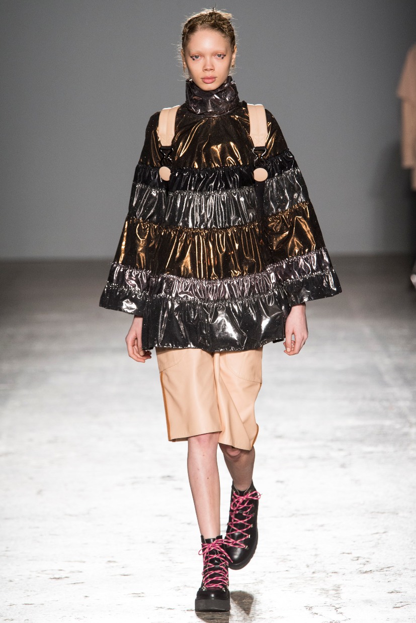I must della collezione sono i capispalla, dalle linee ampie e avvolgenti, talvolta con maniche gonfie ma serrate ai polsi e collo di pelliccia bianca. La texture è complessa, pelo e tessuto laminato stampato sono disposti in una alternanza di pieni e vuoti che formano già di per se una superficie grintosa. Capispalla in pelle lucida nelle tonalità del nero, del marrone, del cammello e cipria, hanno una parvenza più classica; bello e bon-ton, il soprabito in pelle cipria, collo amplio, ma senza revers e senza abbottonatura, un accenno sul davanti della mantellina del trench e cinghietta sulle maniche chiuse da un piatto bottone in tinta. Abbinati a tute pijama in sete color cipria, borchiate sui fianchi, accentuano il loro carattere un po’ militare tanto se in tessuto che se in montone con caldo collo di pelliccia. Interessante il giaccone dal tessuto arricciato nero lucido alternato a bruciato maniche larghe.