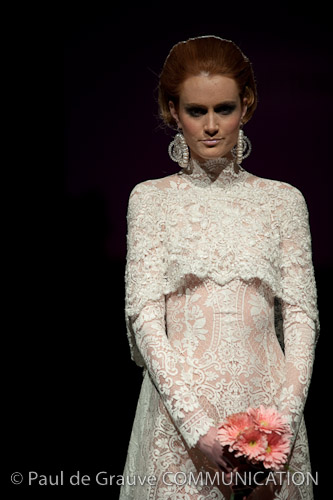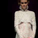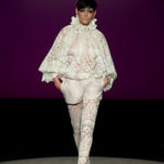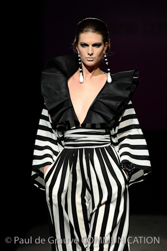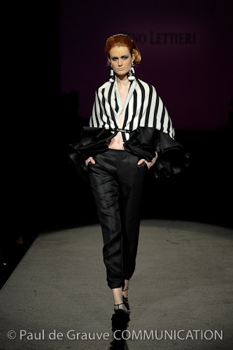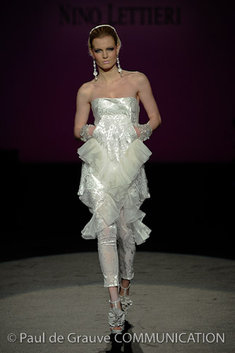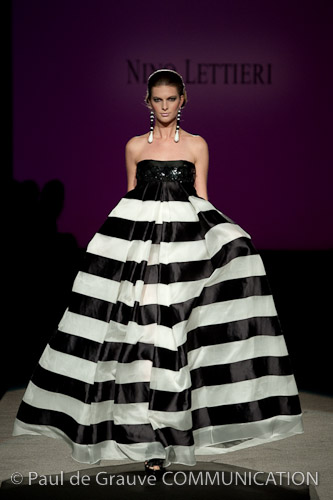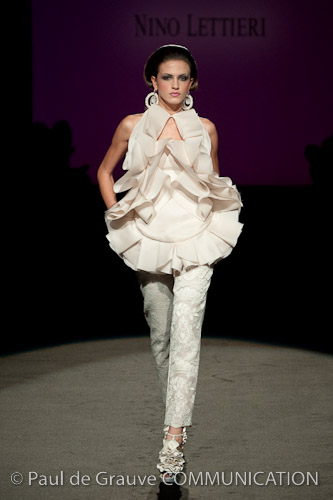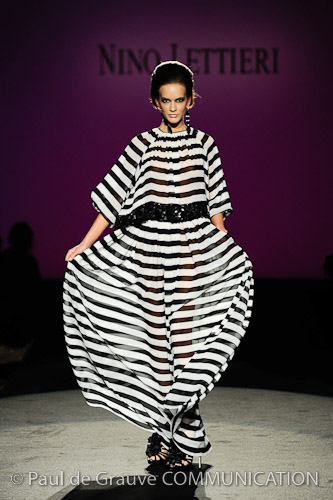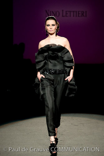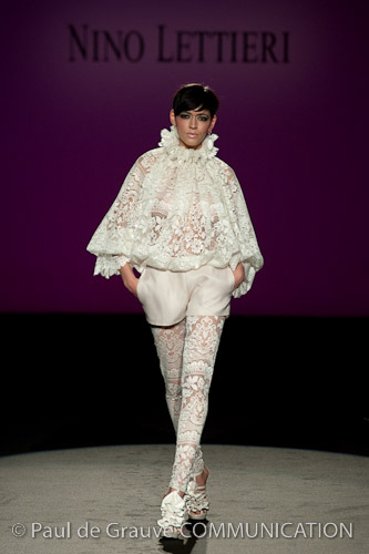 Una collezione rigorosamente scandita da tre colori quella che ha sfilato nella sala Lancisi di S. Spirito in Sassia a firma Nino Lettieri: il nero, il rosa e il bianco, che si susseguono sulla passerella nelle combinazioni nero, bianco e rosa assoluto, nero e bianco e nero rosa ad intarsi. Ispirata a Jacqueline Kennedy il cui gusto preferiva il rosa come colore principale dei suoi capi e dedicata al Maestro Sarli, la collezione ha andamento irregolare, alternandosi creazioni più riuscite ad altre meno coinvolgenti.