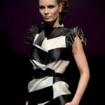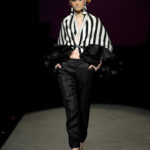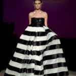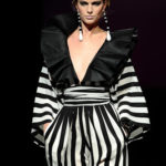 Eleganza e raffinatezza negli abiti lunghi a fasce larghe orizzontali e verticali nella versione “pijama palazzo” con ampio scollo a scialle nero; e nella versione più romantica dell’abito in organza stile impero con corpino nero di paillettes con orecchini chandelier anche essi in bianco e nero.
