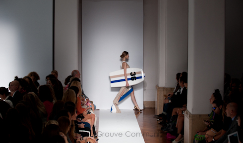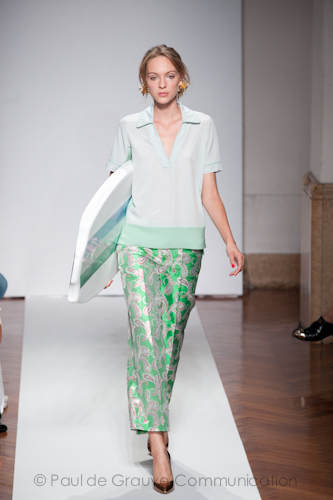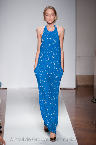 Una paletta tutto colore per una collezione, quella di .normaluisa per la P/E 2013, di ispirazione marinara o meglio surfista come suggeriscono le modelle che entrano in scena con la tavola da surf che ripete i colori del outfit. Rosa cenere, rossi – corallo e fragola e lampone, fuxia -, azzurri e blu mare ed elettrci, verdi flou e lattuga leggerissimi o acquamarina, e i vari sabbia mescolati con i blu e i rosa. Accostamenti di colore talvolta audaci, giustificati alla aria marinara e dall’ispirazione “naturalistica” come il corallo accostato al fuxia, il verde bandiera del soprabito dalle maniche rigonfie che copre l’abitino celeste o il verde lattuga della fascia terminale dell’abito lungo celeste, invertito poi nel due pezzi pantalone pinocchietto e polo verde.