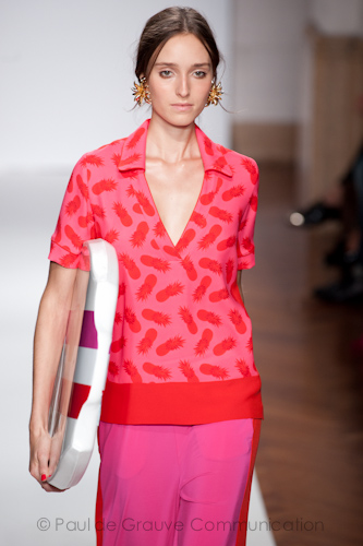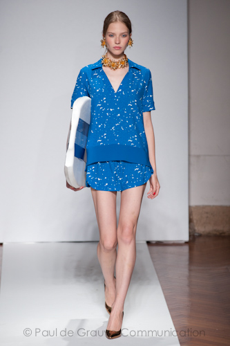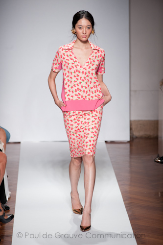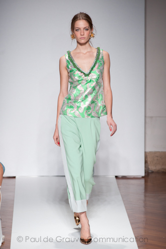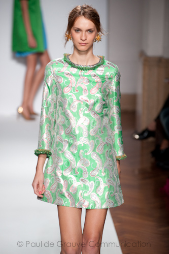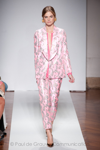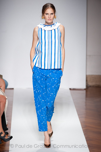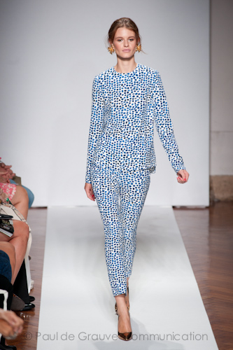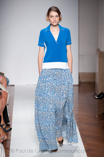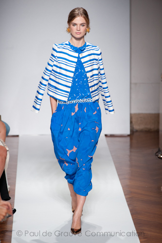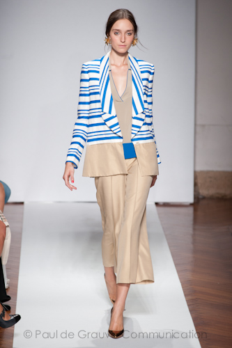 Non mancano le stampe su tessuti lucidi: disegni paisley in grigio per un tailleur pantalone rosa alla caviglia, giacca tuxedo dai rever in posizione e misura non usuali; la stessa stampa in verde acqua su pantalone; top e un abitino corto, manica al gomito e scollo arricchito da canutillas a tono. Altre stampe, punteggiature in blu sembrano ispirarsi agli abitini estivi degli anni ’50. Le righe in bianco e blu costruiscono eleganti giacche, in modo particolari quando gli intarsi moltiplicano i giochi delle geometrie.