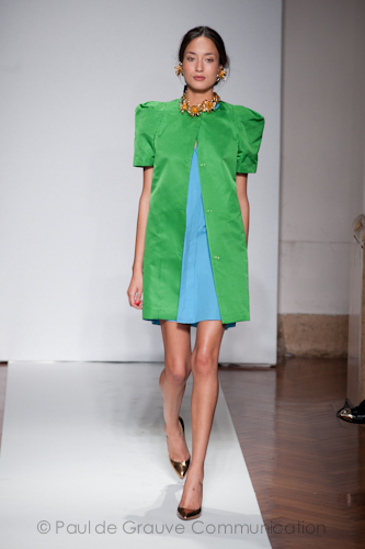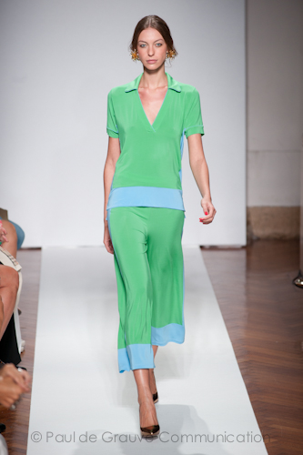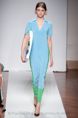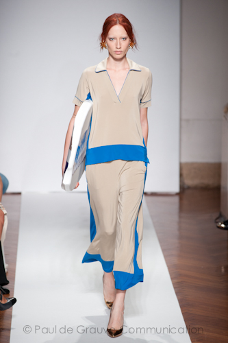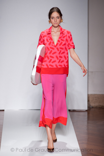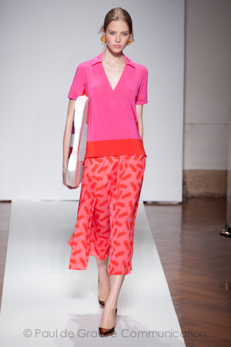 Linea semplice e destrutturata, rettangolare, fluida negli abiti lunghi ad intarsi geometrici verticali che ne accentuano la linearietà. Non mancano però i dettagli più costruiti; le maniche gonfie nell’abito blu arricchito lungo da rouches laterali o nel soprabito verde; i pantaloni bombati. La linea palloncino si affaccia sulla gonna rosa corta con il bomber zippato lucida dalla bella tonalità tabacco, la stessa del trench estivo dalle ricche maniche fermate dal polsino.