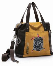 La produzione del caucciù rappresenta un’alternativa economica per le popolazioni locali e contribuisce alla diffusione della loro cultura e tradizione, oltre a salvaguardare le biodiversità del territorio e a proteggere concretamente l’ultimo grande polmone del pianeta. Per questa primavera le giacche mimetiche dell’esercito militare sono riciclate per i borsoni della linea Guaranà, il canvas, il cotone naturale, la fibra di bambù, persino la juta dei sacchi di caffè oppure i teli di camion dismessi e ricamati a mano sviluppano la linea Caipirinha. Stampa di “foglie” serigrafate, invece, per le borse in cotone organico della linea Leaf. Fibbie in noce di cocco, targhette in legno, piccoli dettagli in osso e accessori in metallo solo “nichel free” arricchiscono i borsoni e le bandoliere. E poi i tessuti di foulards, di camicie o abiti dismessi in differenti fantasie foderano le borse rendendole pezzi unici. I colori sono quelli del brasile: verde e giallo declinato nelle sfumature del sabbia, ocra, e senape. Necessariamente eco-friendly. Come le stampe sulla linea di t-shirt realizzate in cotone organico, che riportano messaggi rivolti alla tutela dell’ambiente: ecologia, sostenibilità ed impiego di fonti rinnovabili.