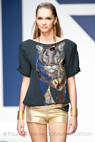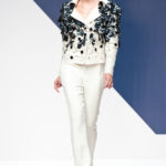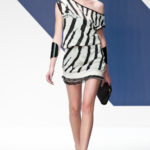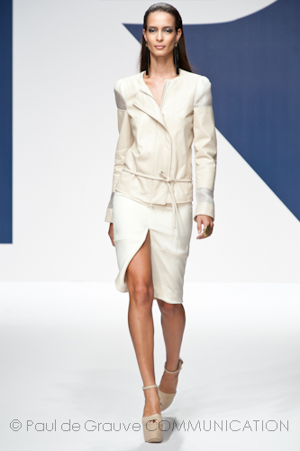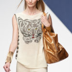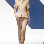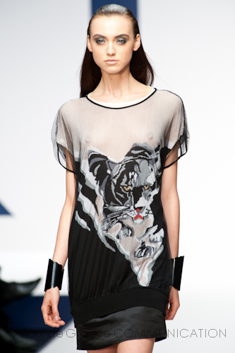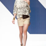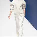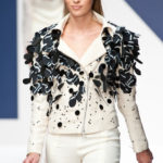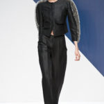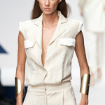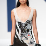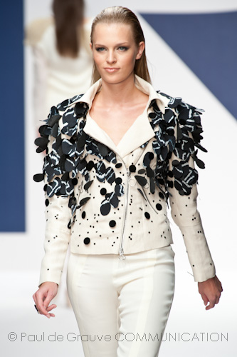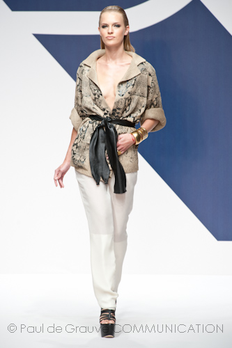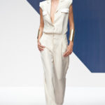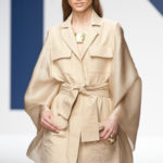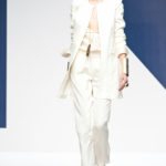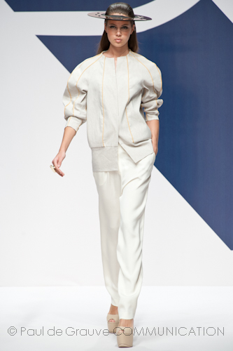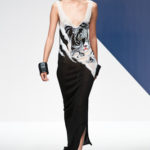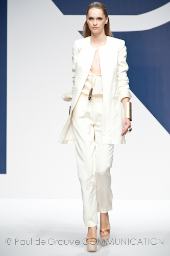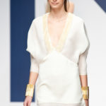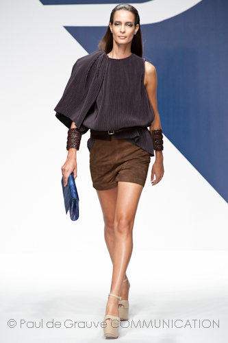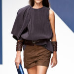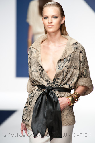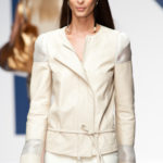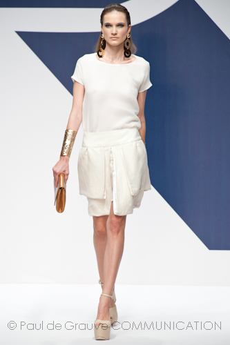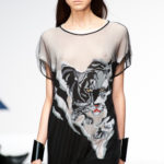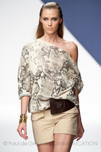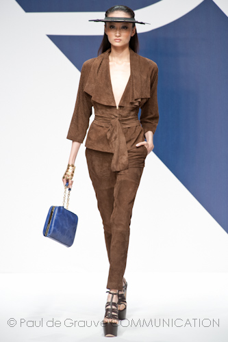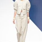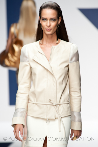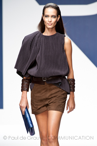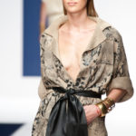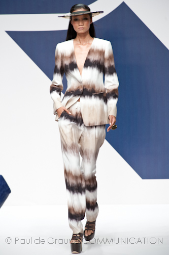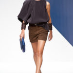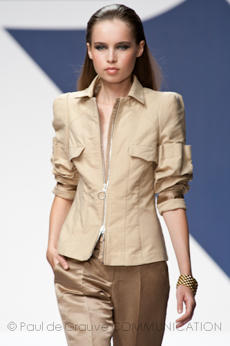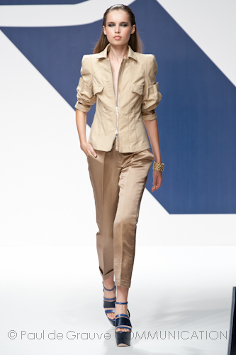 Collezione quindi estremamente misurata, da cui emerge una donna meno androgina, sexy e aggressiva ; più femminile, dolce, misurata, elegante e raffinata, senza ostentazione. Una collezione senza eccessi, dalle linee pulite dove la geometria tonda, tipica di Krizia si alterna ad una geometria rettangolare. Anche alcuni colori sono nuovi, sparito il verde “bandiera” della griffe, appaiono accanto al bianco e al nero, ai bruciati (terra, caffe, cacao), i naturali avorio, sabbia, écru. Bellissimi il blu Tuareg e il cacao del tailleur pantalone in camoscio traforato. Ciò non significa che lo stile Krizia non sia visibile. Spalle ampie e costruite, “allungate” specialmente nei capi senza manica, a volte imbottite con spalline – di felice memoria anni ’80 – come nell’abito bianco smanicato con scaglie nere, maniche gonfie e di linea arcuata; a volte arricchite di altri materiali che ampliano il busto. Bella la giacca gonfia tipicamente della maison con sottili nervature in pelle che costruiscono un cerchio. Accanto a questo la linea più rettangolare nei tailleur pantalone chiari dove la giacca diventa anche una camicia senza maniche; oppure nel tailleur gonna dal profondo spacco e giacca con sottile cintura tubolare poggiata sui fianchi, e nelle gonne con baschina e camicia lenta per non rompere la linearietà dell’outfit. Il plissé ci riporta ancora alle tradizioni Krizia, come le stampe animalier e gli animali pantere e puma molto “espressivi” stampati anche lateralmente su maglieria e tessuti trasparenti, pitoni e coccodrilli; teste di tucani coloratissime ricamate su abiti importanti e negli shorts da sera acquamarina. La collezione affronta anche il tema del viaggio con sahariane – giacche, abiti e soprabiti con tasche con pattina a vista e cintura – in realtà molto “cittadine” tanto da ammettere maniche d’organza o trasformarsi in un robe–manteaux anni ’50 stretto in vita da cintura annodata; o diventare una divertente giacca con zip dove la maniche si arricchiscono di una batteria di scomparti tubolari. Per la sera, le trasparenze attenuate da stampe evidenziano l’anima più sexy della collezione. Dominano i neri e i bianchi. Il bianco arricchito da scaglie nere leggerissime, e i neri da piastrine in pelle nera. Come sempre originali i copricapo, leggere velette – che ricordano i tempi del charleston – con decori più o meno riusciti, oppure una larga e rigida tesa senza calotta; bracciali rigidi alti, lunghi orecchini. E sempre le scarpe con zeppe e tacchi altissimi che certamente danno slancio alla figura e quindi esaltano la linea dell’abito, ma certamente mettono in difficoltà le indossatrici.