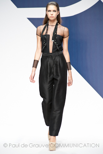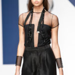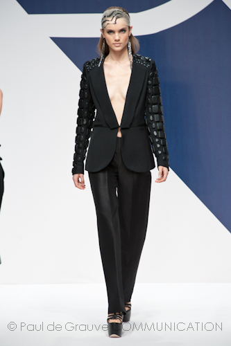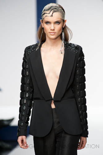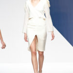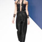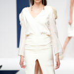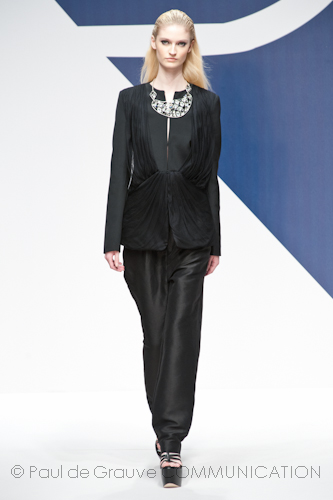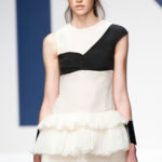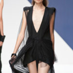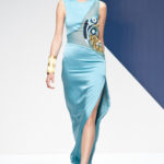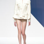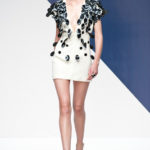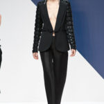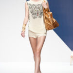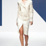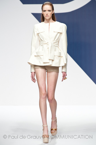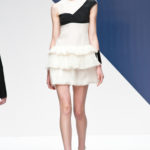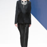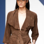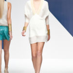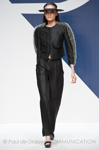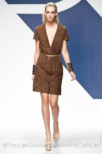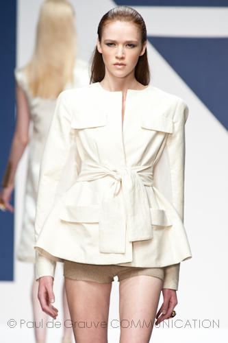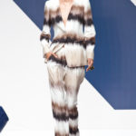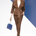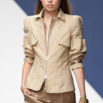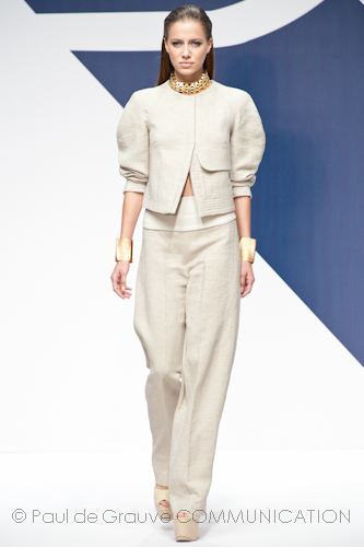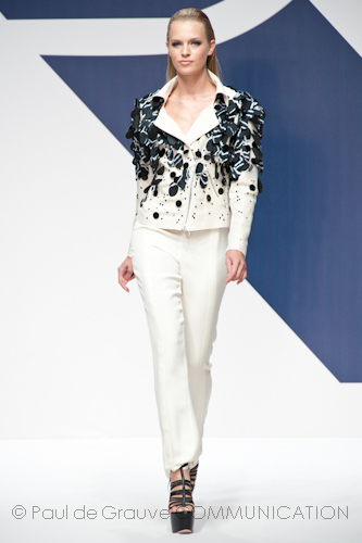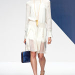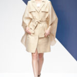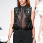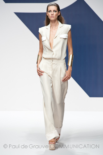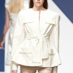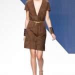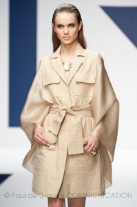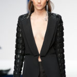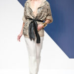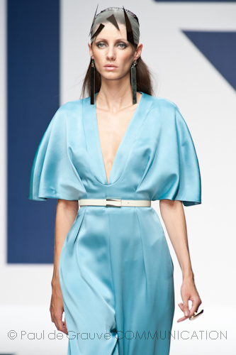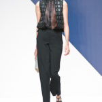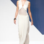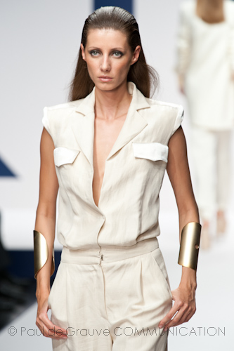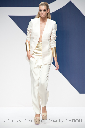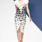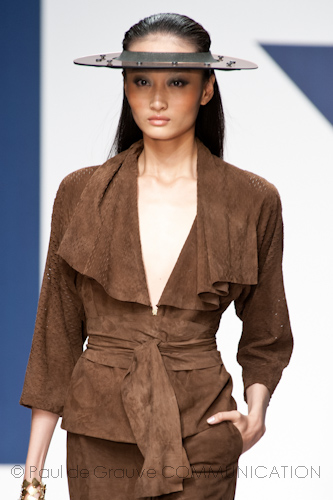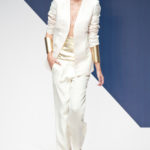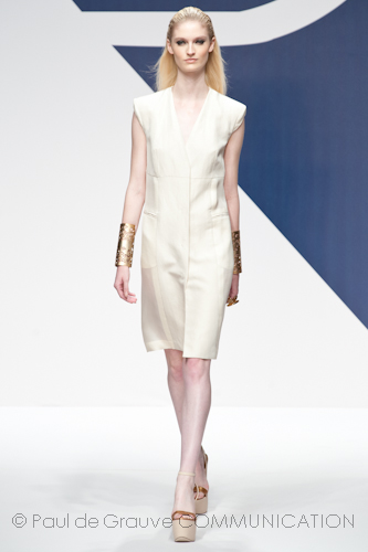 Collezione quindi estremamente misurata, da cui emerge una donna meno androgina, sexy e aggressiva ; più femminile, dolce, misurata, elegante e raffinata, senza ostentazione. Una collezione senza eccessi, dalle linee pulite dove la geometria tonda, tipica di Krizia si alterna ad una geometria rettangolare. Anche alcuni colori sono nuovi, sparito il verde “bandiera” della griffe, appaiono accanto al bianco e al nero, ai bruciati (terra, caffe, cacao), i naturali avorio, sabbia, écru. Bellissimi il blu Tuareg e il cacao del tailleur pantalone in camoscio traforato. Ciò non significa che lo stile Krizia non sia visibile. Spalle ampie e costruite, “allungate” specialmente nei capi senza manica, a volte imbottite con spalline – di felice memoria anni ’80 – come nell’abito bianco smanicato con scaglie nere, maniche gonfie e di linea arcuata; a volte arricchite di altri materiali che ampliano il busto. Bella la giacca gonfia tipicamente della maison con sottili nervature in pelle che costruiscono un cerchio. Accanto a questo la linea più rettangolare nei tailleur pantalone chiari dove la giacca diventa anche una camicia senza maniche; oppure nel tailleur gonna dal profondo spacco e giacca con sottile cintura tubolare poggiata sui fianchi, e nelle gonne con baschina e camicia lenta per non rompere la linearietà dell’outfit. Il plissé ci riporta ancora alle tradizioni Krizia, come le stampe animalier e gli animali pantere e puma molto “espressivi” stampati anche lateralmente su maglieria e tessuti trasparenti, pitoni e coccodrilli; teste di tucani coloratissime ricamate su abiti importanti e negli shorts da sera acquamarina. La collezione affronta anche il tema del viaggio con sahariane – giacche, abiti e soprabiti con tasche con pattina a vista e cintura – in realtà molto “cittadine” tanto da ammettere maniche d’organza o trasformarsi in un robe–manteaux anni ’50 stretto in vita da cintura annodata; o diventare una divertente giacca con zip dove la maniche si arricchiscono di una batteria di scomparti tubolari. Per la sera, le trasparenze attenuate da stampe evidenziano l’anima più sexy della collezione. Dominano i neri e i bianchi. Il bianco arricchito da scaglie nere leggerissime, e i neri da piastrine in pelle nera. Come sempre originali i copricapo, leggere velette – che ricordano i tempi del charleston – con decori più o meno riusciti, oppure una larga e rigida tesa senza calotta; bracciali rigidi alti, lunghi orecchini. E sempre le scarpe con zeppe e tacchi altissimi che certamente danno slancio alla figura e quindi esaltano la linea dell’abito, ma certamente mettono in difficoltà le indossatrici.