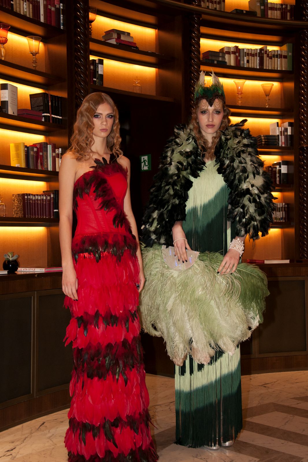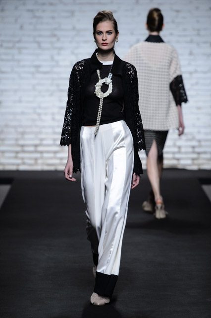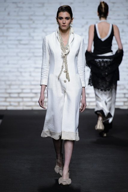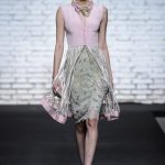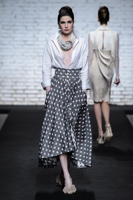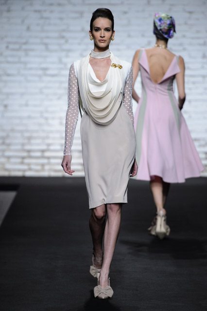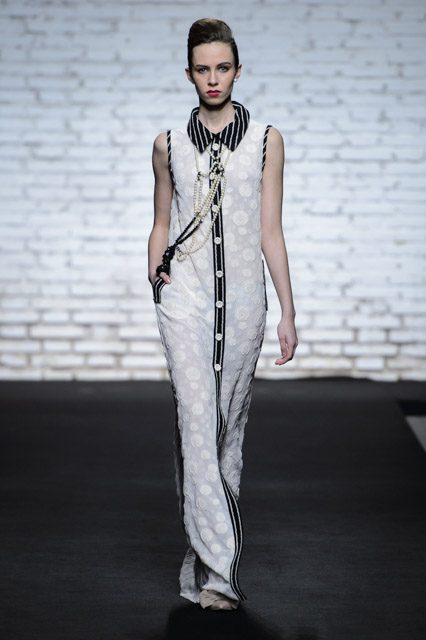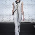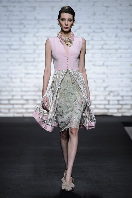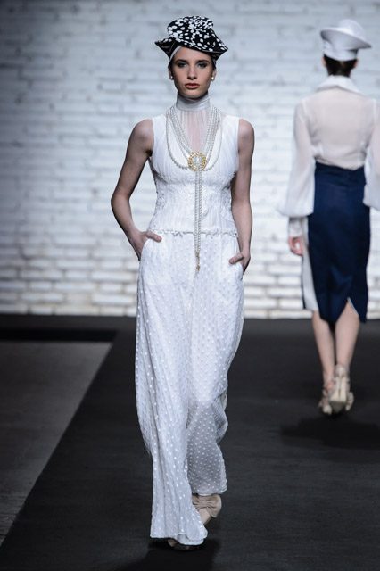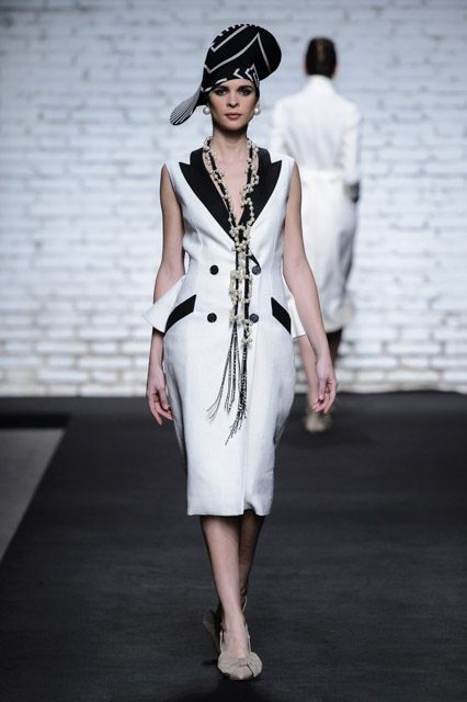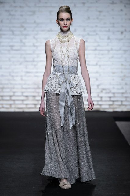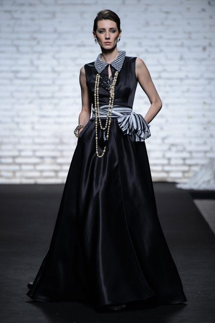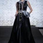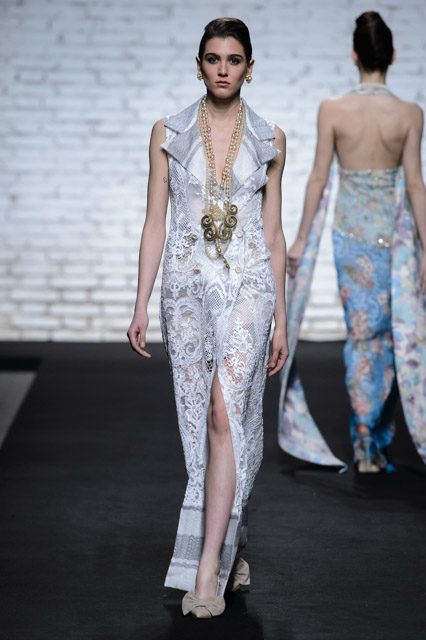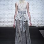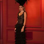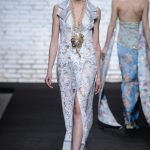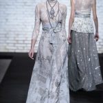 Sono mise opulente ed eccentriche, cariche e stravaganti quelle proposte dal giovane stilista; corredate da grandi boa e ventagli di struzzo in colori sfumati, da copricapo di piume e catene dall’effetto teatrale; raffinate gorgiere e splendidi gioielli di lavorazione artigianale d’Haute Couture “Le Vitali”come i lunghissimi lacci di perle bianche e grigie da rigirare più volte intorno al collo, per arricchire abiti da mille e una notte, o i meravigliosi orecchini con pendenti di perle, ematite, opale rosa ed ametiste.