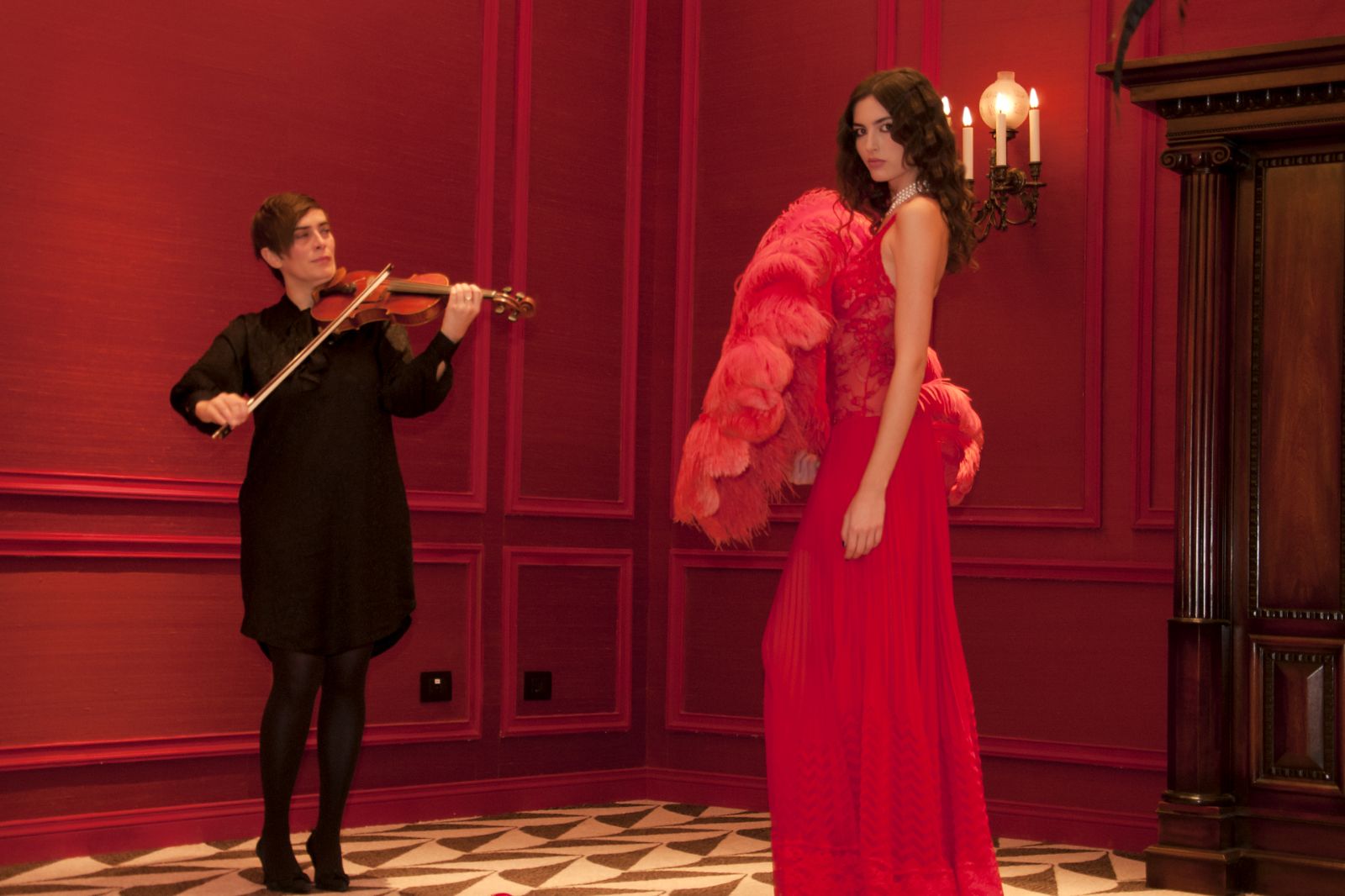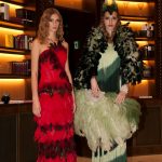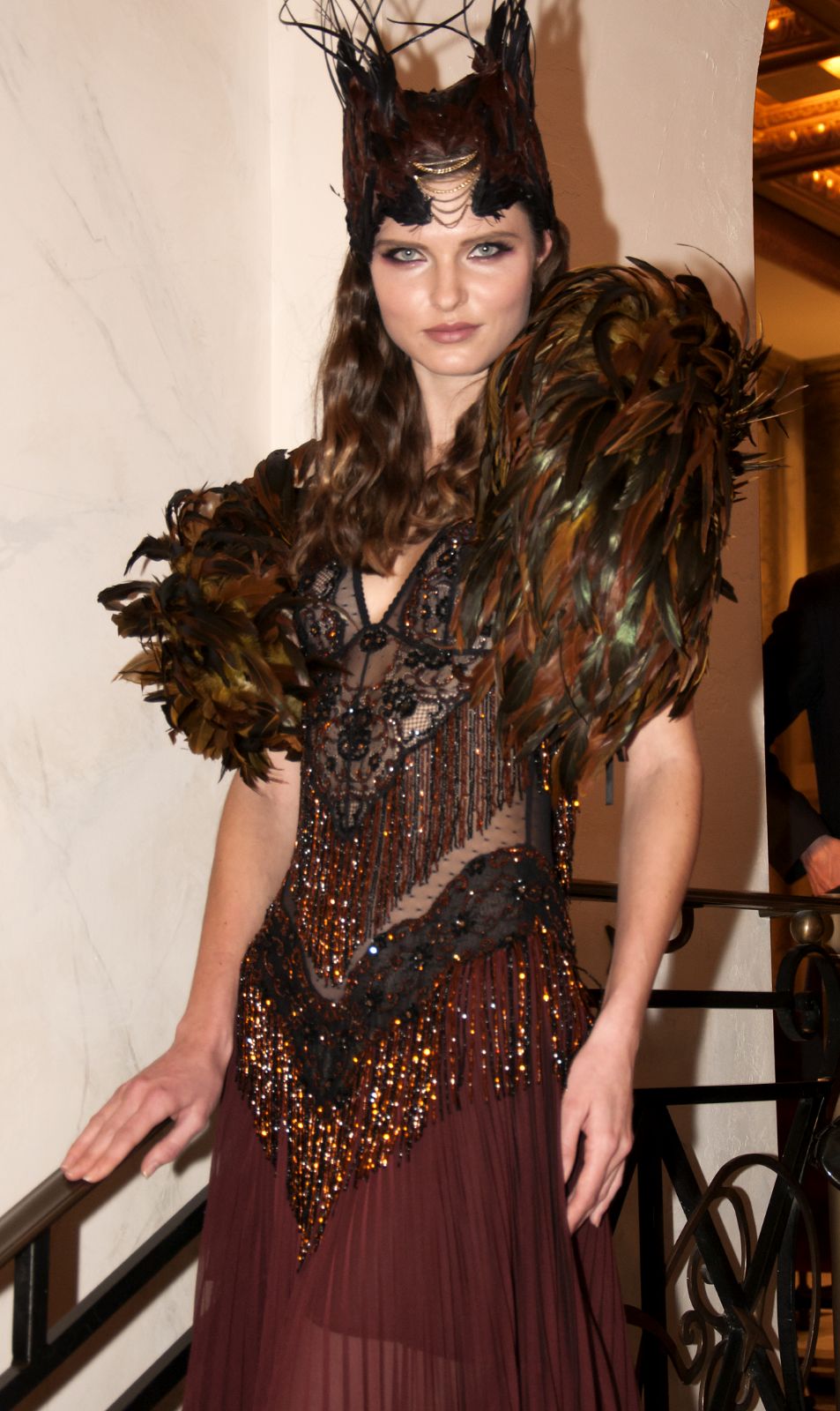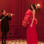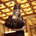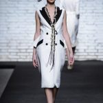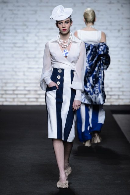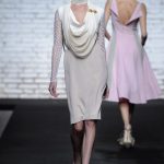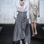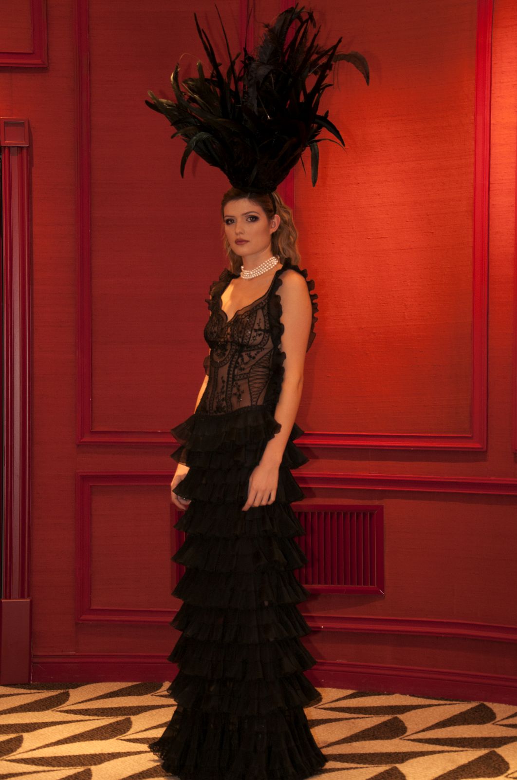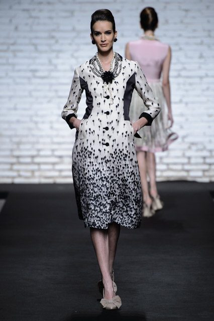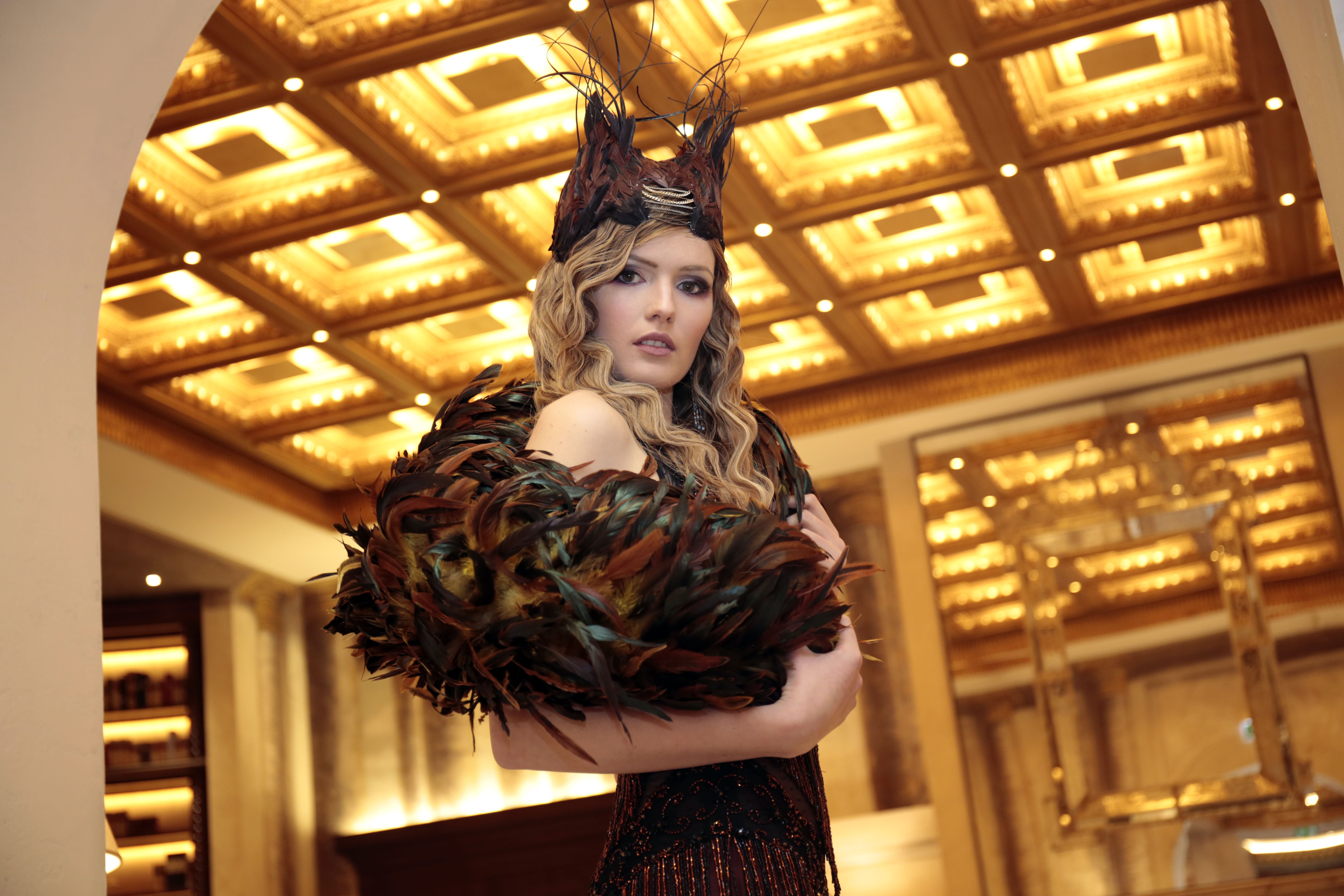 Sono mise opulente ed eccentriche, cariche e stravaganti quelle proposte dal giovane stilista; corredate da grandi boa e ventagli di struzzo in colori sfumati, da copricapo di piume e catene dall’effetto teatrale; raffinate gorgiere e splendidi gioielli di lavorazione artigianale d’Haute Couture “Le Vitali”come i lunghissimi lacci di perle bianche e grigie da rigirare più volte intorno al collo, per arricchire abiti da mille e una notte, o i meravigliosi orecchini con pendenti di perle, ematite, opale rosa ed ametiste.