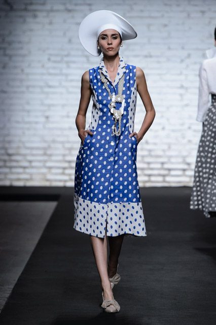 Il tutto, per una palette che vibra di tenui colori pastello, il celeste, il rosa, il verde chiarissimo, il giallo pallido e nella quale non mancano i neutri bianco e nero, né le pennellate di blu dipinte su tessuti pregiatissimi, sui migliori lini, le più raffinate sete, ed i cotoni dalla trama fitta talvolta tinta unita, talaltra in giochi di righe e pois.