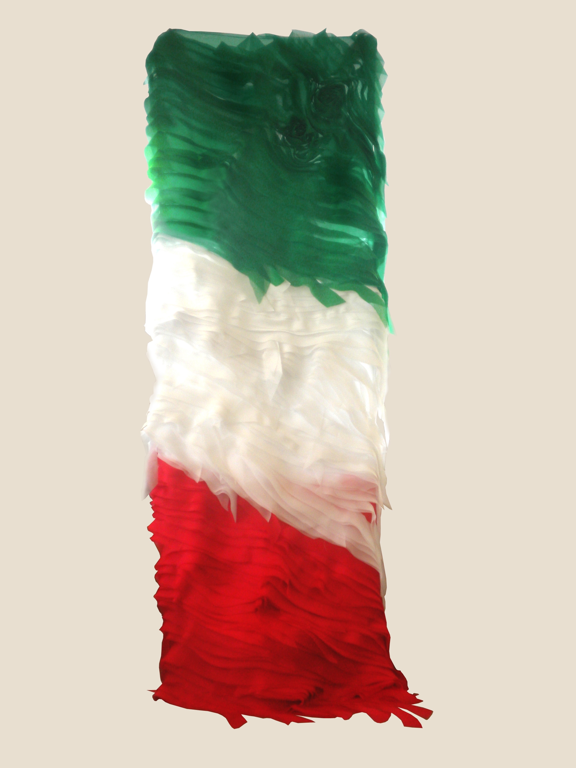 Dalle stampe animalier di Cavalli all’organza e alle sete di Scervino, per finire all’effetto patchwork in cachemire di Etro, un trionfo di creatività e ricercatezza per l’interpretazione di uno dei simboli più rappresentativi dell’intero Stivale: il tricolore.