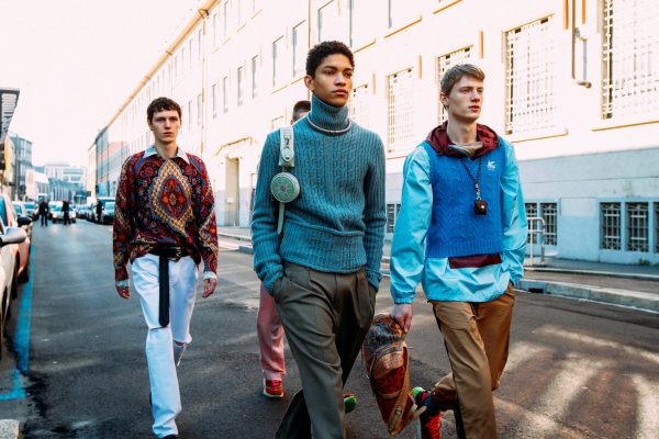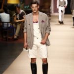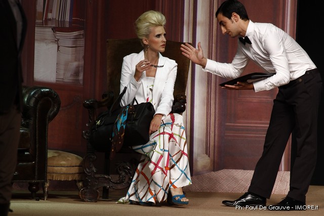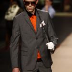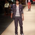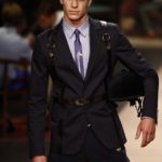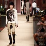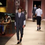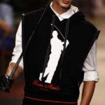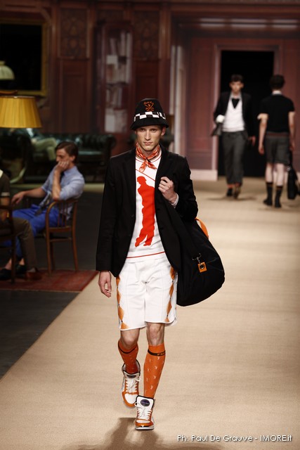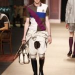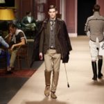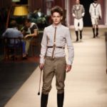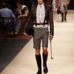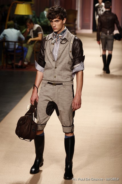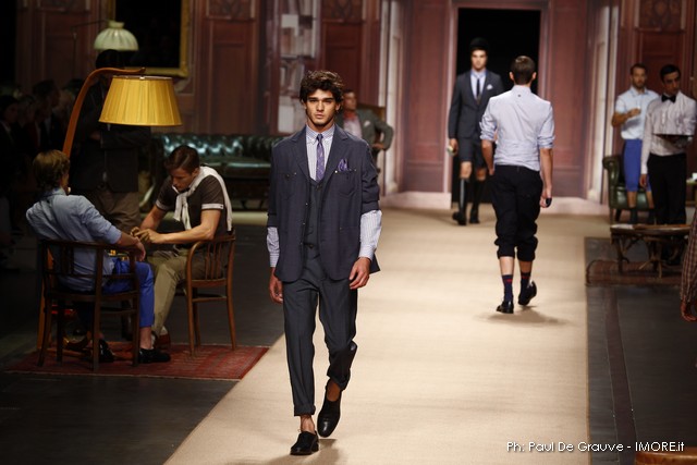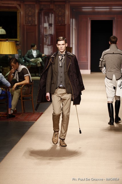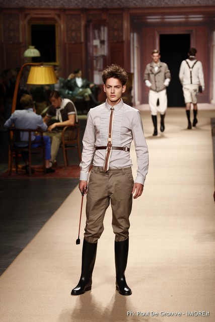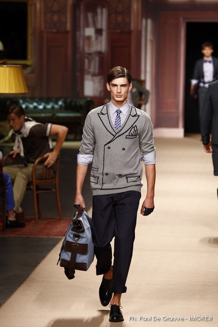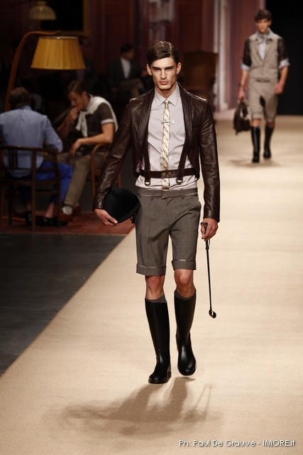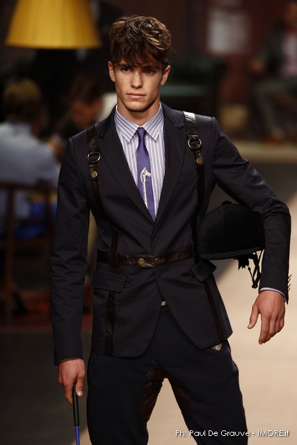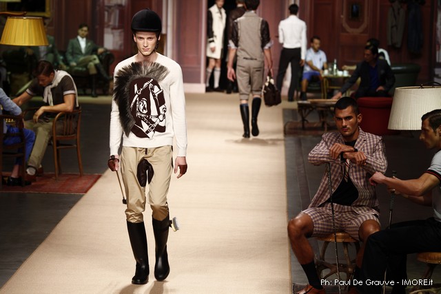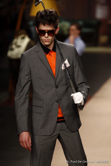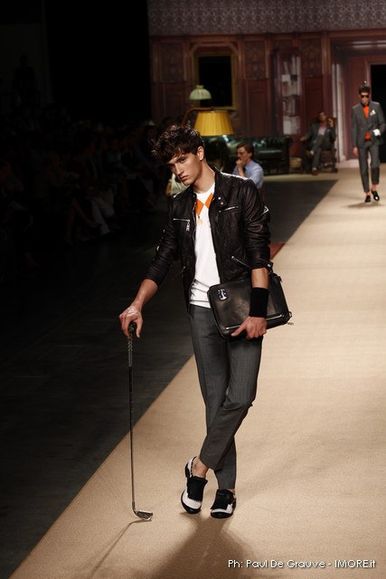Così i modelli sfilano con frustini, mazze , guantoni e gli stampati richiamano le briglie , le cuciture delle palle da baseball o l’immagine tipica dello “swing” , il movimento del giocatore di golf. Sport tipicamente anglosassoni ed è inevitabile quindi che le giacche siano in stile inglese, con i profili bordati a contrasto, a due bottoni anche con inserti in pelle alla maniera delle “cavezze” e delle “lunghine” , i pantaloni tendenzialmente a sigaretta o bermuda con i rinforzi interno coscia in pelle per usi cavallereschi.