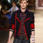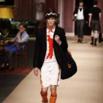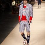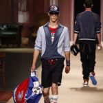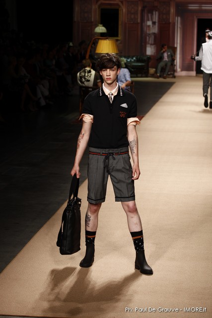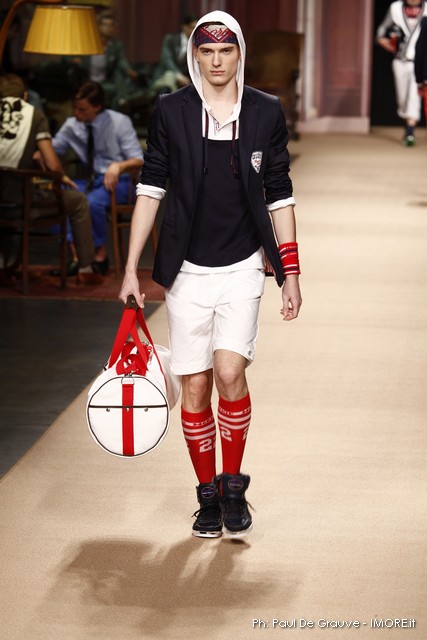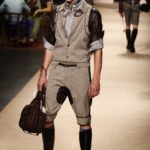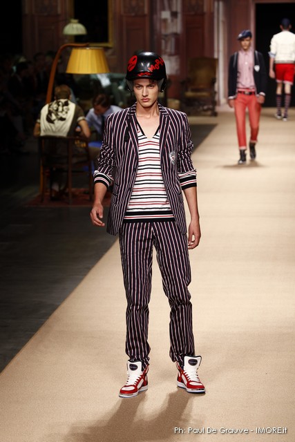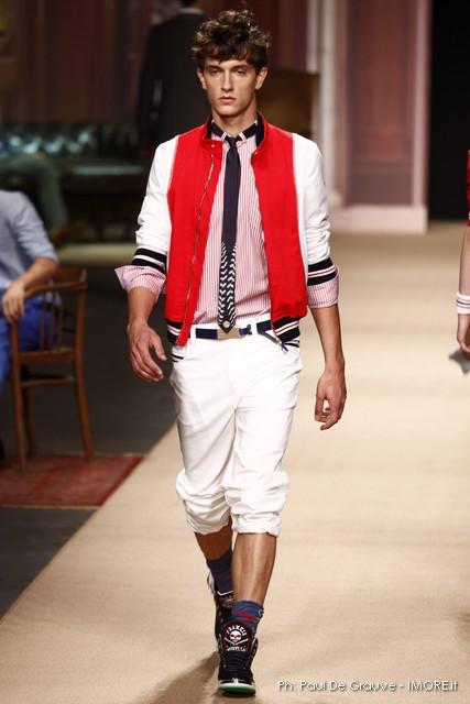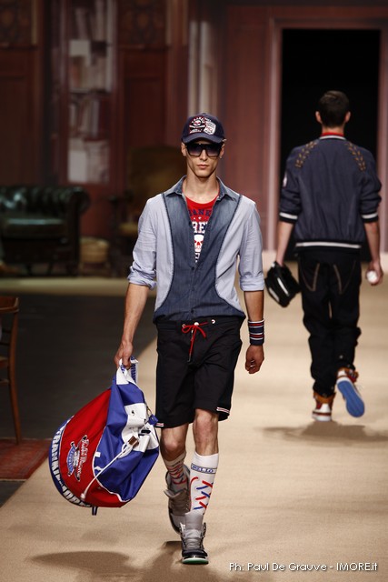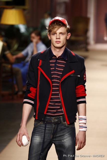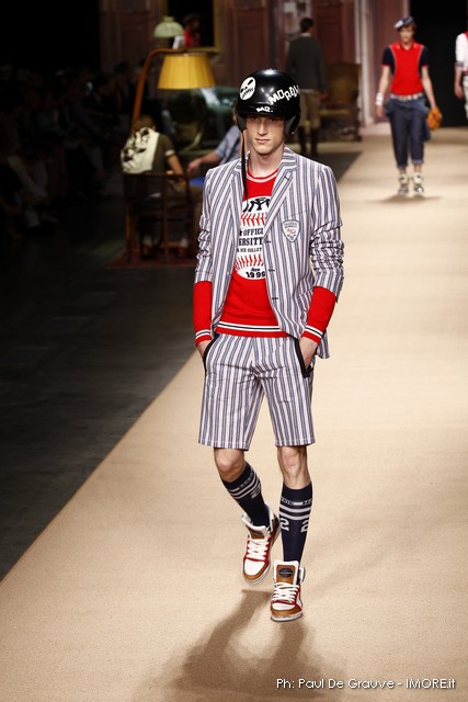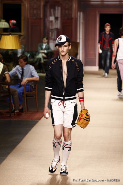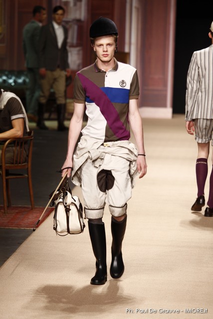 I pullover e i blazer hanno gli stemmi o le losanghe , immancabili le gag e le calze alte fino a sotto il ginocchio i colori sono quelli country con incursioni dell’arancio del celeste , del rosso e del blu elettrico. La parte più informale della collezione è affidata al tema del baseball con i giubbini anni 50, cuciture e profili che citano lo sport e i suoi strumenti nelle felpe e anche nei jeans portati con scarpe comode da gang giovanile.