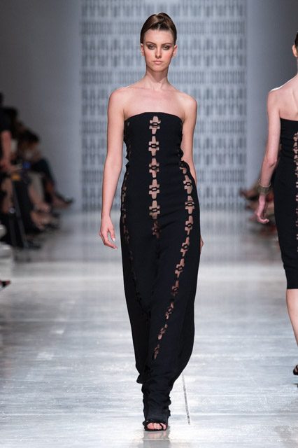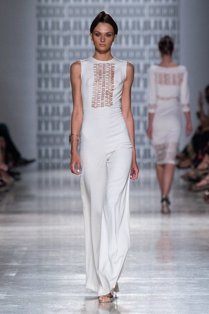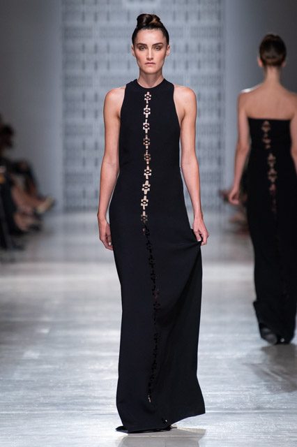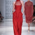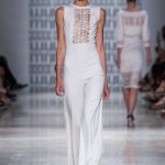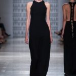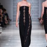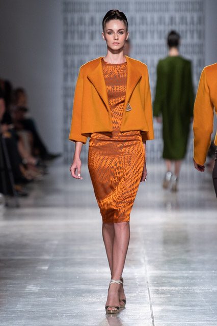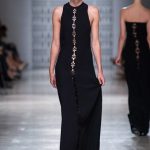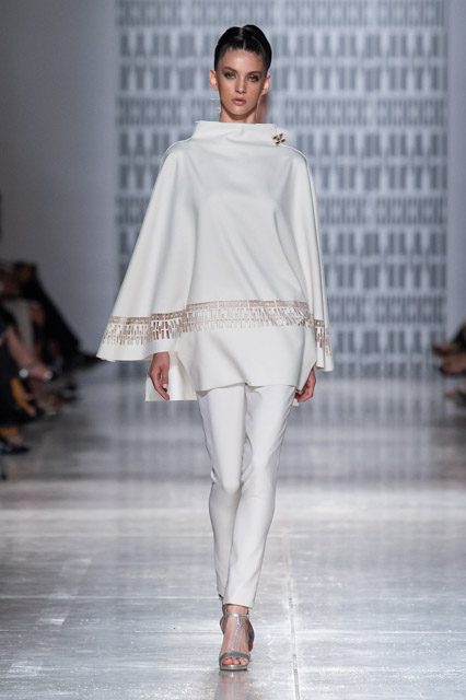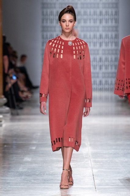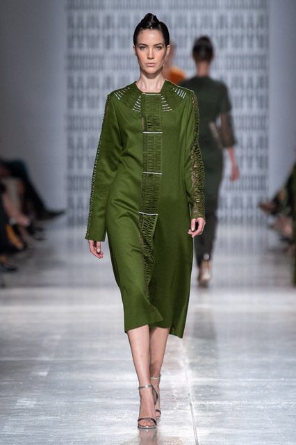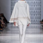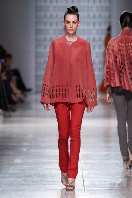 In passerella, allure d’altri tempi, un’alternanza tra abiti da pomeriggio, da cocktail e da grande soirée. Silhouette dal gusto retrò che riportano la mente a varie annate del secolo scorso, si alternano rapide e catturano l’attenzione del parterre intervenuto, una passeggiata negli anni sessanta, settanta e ottanta, studiati e rivisitati poi da uno sguardo lucido e contemporaneo: cappe dal gusto sartoriale, paltò importanti, tubini strutturati , tute dalle linee fluide, scolli all’americana, giacche trapezoidali dal piglio classicheggiante, abitini e pantaloni dritti. Volumi contenuti e linee semplici.