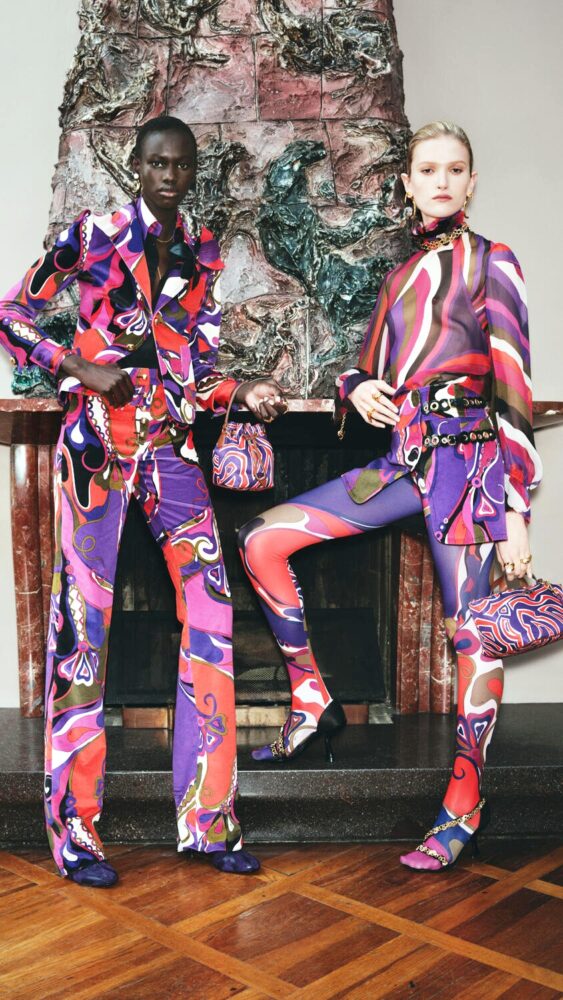 E’ la stessa stilista a dichiarare che il suo lavoro si è concentrato sulle stampe iconiche della maison, rielaborate e mescolate in modo più personale; ma anche reinventate in nuove proporzioni e dimensioni: un lavoro portato sui colori e sulle forme, ma nel rispetto dei disegni originali. Riconosciamo Labirinto dalle forme irregolari che assomigliano a macchie di leopardo in uno schema di colore nero, beige e oro; Istrice che alterna linee arrotondate e frastagliate nei toni del fucsia, del rosso e del viola; Collane propone un gioco geometrico verticale di cerchi e rombi; Volute ha un effetto allungato, tanto slanciato quanto suggestivo; Astro con la sua grafica a spirale, era tra le stampe preferite di Emilio Pucci per i caftani; Hawaii esplode come un simbolo solare su sfondo unito monocromatico. Richiamano l’attenzione i due abiti Iride, corto al ginocchio e lungo alla caviglia in jersey lurex lucido che Naomi Campbelle indossa nella campagna pubblicitaria scattata da Oliver Hadlee Pearch.